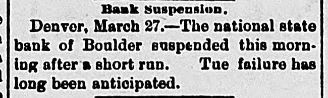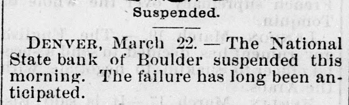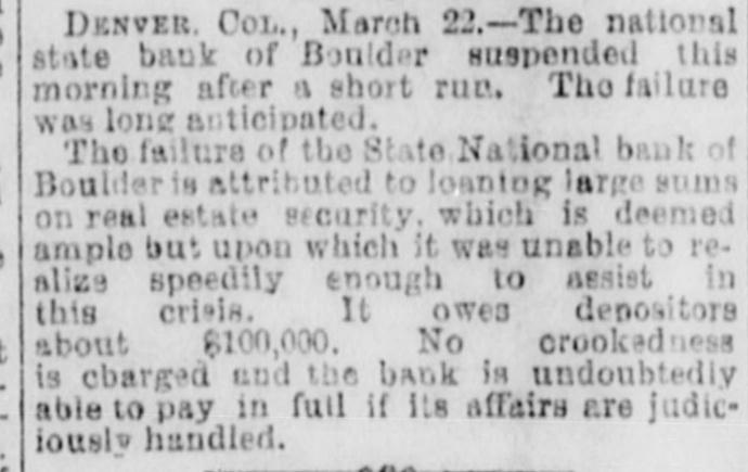 DENVER. COL., March 22.-The national state bank of Boulder suspended this morning after a short run. The failure was long anticipated. The failure of the State National bank of Boulder is attributed to loaning large sums on real estate security. which is deemed ample but upon which it was unable to realize speedily enough to assist in It owes depositors crieis. this No crookedness about $100,000. is cbarged and the bank is undoubtedly able to pay in full if its affairs are judiciously handled.