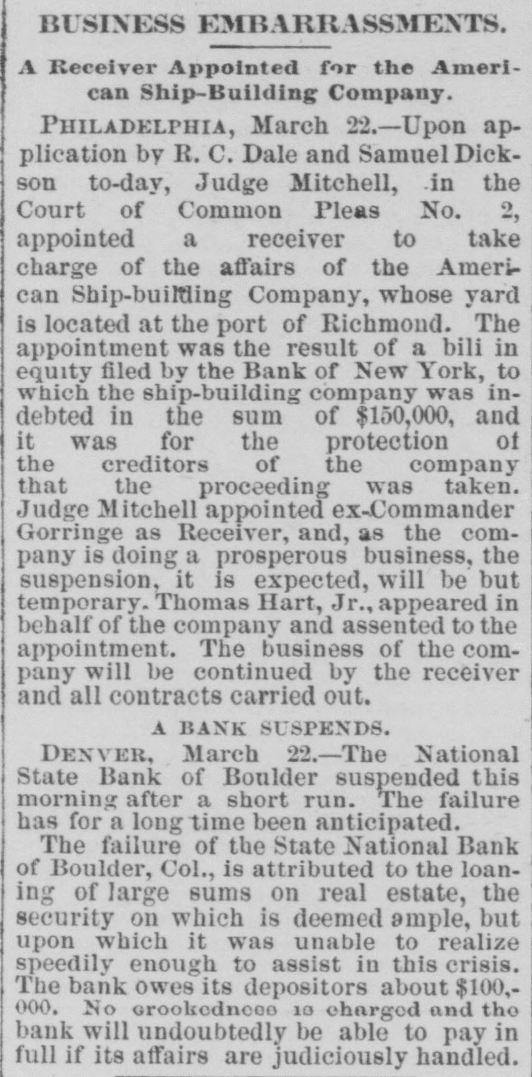 BUSINESS EMBARRASSMENTS. A Receiver Appointed for the American Ship-Building Company. PHILADELPHIA, March 22.-Upon application by R. C. Dale and Samuel Dickson to-day, Judge Mitchell, .in the Court of Common Pleas No. 2, appointed a receiver to take charge of the affairs of the American Ship-building Company, whose yard is located at the port of Richmond. The appointment was the result of a bili in equity filed by the Bank of New York, to which the ship-building company was indebted in the sum of $150,000, and it was for the protection of the creditors of the company that the proceeding was taken. Judge Mitchell appointed ex-Commander Gorringe as Receiver, and, as the company is doing a prosperous business, the suspension, it is expected, will be but temporary. Thomas Hart, Jr., appeared in behalf of the company and assented to the appointment. The business of the company will be continued by the receiver and all contracts carried out. A BANK SUSPENDS. DENVER, March 22.-The National State Bank of Boulder suspended this morning after a short run. The failure has for a long time been anticipated. The failure of the State National Bank of Boulder, Col., is attributed to the loaning of large sums on real estate, the security on which is deemed ample, but upon which it was unable to realize speedily enough to assist in this crisis. The bank owes its depositors about $100,000. No grookedness 10 charged and the bank will undoubtedly be able to pay in full if its affairs are judiciously handled.
