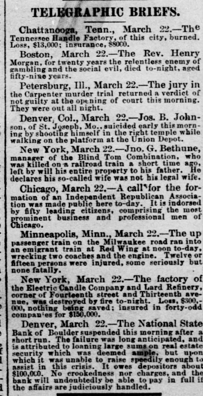 TELEGRAPHIC BRIEFS. Chattanooga, Tenn., March 22.-The Tennessee Handle Factory, of this city, burned. Loss, $13,000; insurance, $8000. Boston, March 22.-The Rev. Henry Morgan, for twenty years the relentless enemy of gambling and the social evil, died to-night, aged fifty-nise years. Petersburg, Ill., March 22.-The jury in the Carpenter murder trial returned a verdict of not guilty at the opening of court this morning. They were out all night. Denver, Col., March 22.-Jos. B. Johnson, of St. Joseph, Mo. suicided early this morning by shooting himself in the right temple while walking on the platform at the Union Depot. New York, March 22.-Jno. G. Bethune, manager of the Blind Tom Combination, who was killed on a railroad train a short time ago, left by will his entire property to his father. He declares his so-called wife was not his legal wife. Chicago, March 22.-A call for the formation of an Independent Republican Association was made public here to-day. It is indorsed by fifty leading citizens, comprising the most prominent business and professional men of Chicago. Minneapolis, Minn., March -The up passenger train on the Milwaukee road ran into an emigrant train at Red Wing at noon to-day, wrecking two coaches and the engine. Twelve or fifteen persons were injured, some seriously but none fatally. New York, March 22.-The factory of the Electric Candle Company and Lard Refinery, corner of Fourteenth street and Thirteenth avenue, was destroyed by fire to-night. Loss, $300,000, nothing being saved: insured in forty-odd companies for $150,000. Denver, March 22.-The National State Bank of Boulder suspended this morning after a short run. The failure was long anticipated, and is attributed to loaning large sums on real estate security which was deemed ample, but upon which it was unable to raise speedily enough to assist in this erisis. It owes depositors about $100,000. No crookedness nor charges, and the bank will undoubtedly be able to pay in full if the affairs are judiciously handled. 1
