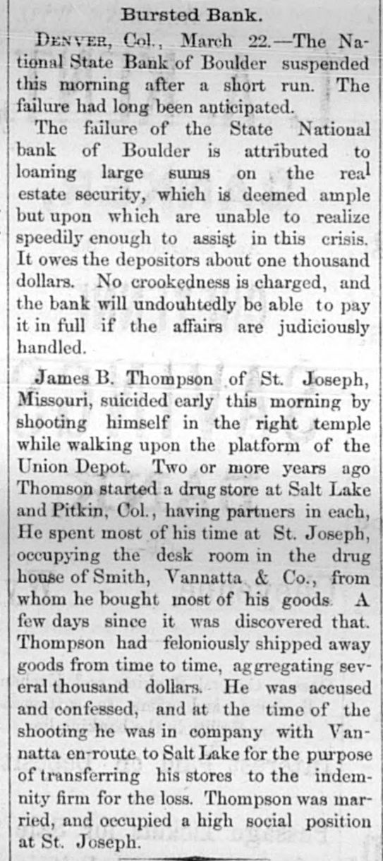 Bursted Bank. DENVER, Col., March 22.-The National State Bank of Boulder suspended this morning after a short run. The failure had long been anticipated. The failure of the State National bank of Boulder is attributed to loaning large sums on the real estate security, which is deemed ample but upon which are unable to realize speedily enough to assist in this crisis. It owes the depositors about one thousand dollars. No crookedness is charged, and the bank will undouhtedly be able to pay it in full if the affairs are judiciously handled. James B. Thompson of St. Joseph, Missouri, suicided early this morning by shooting himself in the right temple while walking upon the platform of the Union Depot. Two or more years ago Thomson started a drug store at Salt Lake and Pitkin, Col., having partners in each, He spent most of his time at St. Joseph, occupying the desk room in the drug house of Smith, Vannatta & Co., from whom he bought most of his goods. A few days since it was discovered that. Thompson had feloniously shipped away goods from time to time, aggregating several thousand dollars. He was accused and confessed, and at the time of the shooting he was in company with Vannatta en-route to Salt Lake for the purpose of transferring his stores to the indemnity firm for the loss. Thompson was married, and occupied a high social position at St. Joseph.
