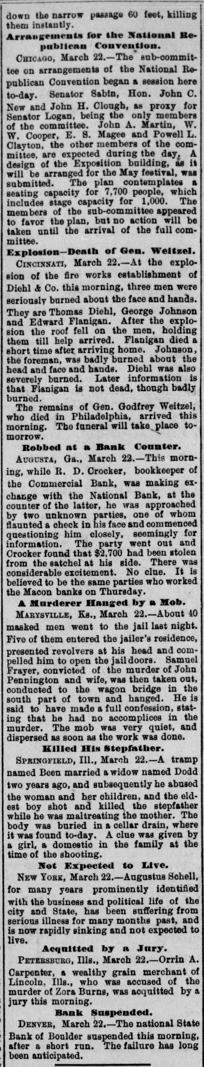 down the narrow passage 60 feet, killing them instantly. Arrangements for the National Republican Convention. CHICAGO, March 22.-The sub-committee on arrangements of the National Republican Convention began & session here to-day. Senator Sabin, Hon. John C. New and John H. Clough, as proxy for Senator Logan, being the only members of the committee. John A. Martin, W. W. Cooper, E. S. Magee and Powell L. Clayton, the other members of the committee, are expected during the day, A design of the Exposition building, as it will be arranged for the May festival, was submitted. The plan contemplates a seating capacity for 7,700 people, which includes stage capacity for 1,000. The members of the sub-committee appeared to favor the plan, but no action will be taken until the arrival of the full committee. Explosion-Death of Gen. Weitzel. CINCINNATI, March 22.-At the explosion of the fire works establishment of Diehl & Co. this morning, three men were seriously burned about the face and hands. They are Thomas Diehl, George Johnson and Edward Flanigan. After the explosion the roof fell on the men, holding them till help arrived. Flanigan died a short time after arriving home. Johnson, the foreman, was badly burned about the head and face and hands. Diehl was also severely burned. Later information is that Flanigan is not dead, though badly burned. The remains of Gen. Godfrey Weitzel, who died in Philadelphia, arrived this morning. The funeral will take place tomorrow. Robbed at a Bank Counter. AUGUSTA, Ga., March 22.-This morning, while R. D. Crocker, bookkeeper of the Commercial Bank, was making exchange with the National Bank, at the counter of the latter, he was approached by two unknown parties, one of whom flaunted a check in his face and commenced questioning him closely, seemingly for information. The party went out and Crocker found that $2,700 had been stolen from the satchel at his side. There was considerable excitement. No clue. It is believed to be the same parties who worked the Macon banks on Thursday. Murderer Hanged by a Mob. MARYSVILLE, Ks., March 22.-About 40 masked men went to the jail last night. Five of them entered the jailer's residence, presented revolvers at his head and compelled him to open the doors. Samuel Frayer, convicted of the murder of John Pennington and wife, was then taken out, conducted to the wagon bridge in the south part of town and hanged. He is said to have made a full confession, stating that he had no accomplices in the murder. The mob was very quiet, and dispersed as soon as the work was done. Killed His Stepfather. SPRINGFIELD, Ill., March 22.-A tramp named Been married & widow named Dodd two years ago, and subsequently he abused the woman and her children, and the eldest boy shot and killed the stepfather while he was maltreating the mother. The body was buried in a cellar drain, where it was found to-day. A clue was given by a girl, a domestic in the family at the time of the shooting. Not Expected to Live. NEW YORK, March 22.-Augustus Schell, for many years prominently identified with the business and political life of the city and State, has been suffering from serious illness for many months past, and is now rapidly sinking and not expected to live. Acquitted by a Jury. PETERSBURG, Ills., March 22.-Orrin A. Carpenter, & wealthy grain merchant of Lincoln, Ills., who was accused of the murder of Zora Burns, was acquitted by a jury this morning. Bank Suspended. DENVER, March 22.-The national State Bank of Boulder suspended this morning, after a short run. The failure has long been anticipated.