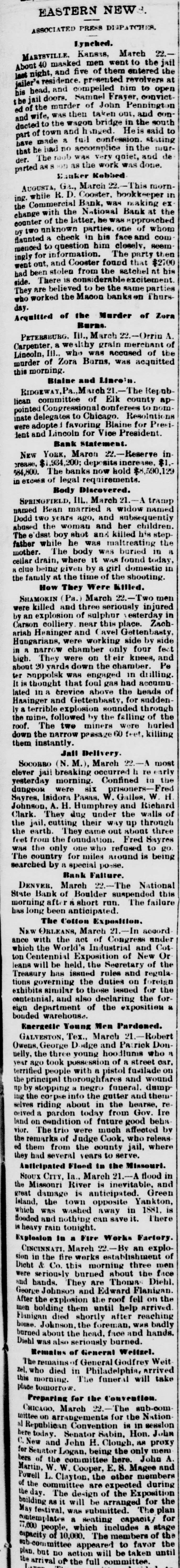 EASTERN NEWS. ASSOCIATED PRESS DISPATCHES. Lynched. MABYSVILLE, Kansas, March 22.About 40 masked men went to the jail last night, and five of them entered the jailer's residence. presented revolvers at his head, and compelled him to open the jail doors. Samuel Frayer, convict. ed of the murder of John Pennington and wife, was then taken out. and conducted to the wagon bridge in the south part of town and h inged. Hei is said to have made a full confession. stating that he had no accomplice in the murder. The mob was very quiet, and de parted as on as the work was done. Banker Robbed AUGUSTA, Ga., March morning. while R. D. Cooster, bookkeeper in the Commercial Bank, was making ex change with the National Bank at the counter of the latter, be was approached by two unknown parties. one of whom flaunted a check in his face and com menoed to question him closely, seem ingly for information. The party then went out, and Cooster found that $2700 had been stolen from the satchel nt bis side. There is considerableexcitement They are believed to be the same parties who worked the Macon banksen Thursday. Acquitted of the Murder of Zora Burns. PETERSBURG. III., March 22.-Orrin A. Carpenter, a wealthy grain merchant of Lincoln, III., who was accused of the murder of Zora Burns, was acquitted this morning. Biaine and Lincoin. RIDGEWAY, arch Republican committee of Elk county appointed Congressional conferees to nominate delegates to Chicago. Resolution ns were adopted favoring Blaine for President and Lincoln for Vice President. Bank Statement. NEW YORK, Maron 22.-Reserve in crease, $1,934,200; deposits increase, $1.584,800. The banks now hold $8,590,129 in 010488 of legal requirements. Body Discovered. SPRINGFIELD, III., March 21.-A tramp named Bean married a widow named Dodd two years ago, and subsequently abused the woman and her children. The dsst boy shot and killed his stepfather while he was maltreating the mother. The body was buried in a cellar drain, where it WAS found today, a clue being given by a girl domestic in the family at the time of the shooting. How They Were Killed. SHAMOKIN (Pa.) March 22.-Two men were killed and three seriously injured by an explosion of sulphor esterday in Carson colliery near this place. Zachariab Heainger and Cavel Gettenbasty, Hungarians, were working side by side in A narrow chamber only four fect high. They were on their knees, and about 20 yards down the chamber. Pe ter suppolsk was engaged in drilling. It is thought that foul gas had accumu lated in a crevice above the heads of Hasinger and Gettenbasty, for suddenly a terrible explosion sounded through the mine, followed by the falling of the roof. The two miners were hurled down the narrow passage 60 feet, killing them instantly. Jall Delivery. SOCORRO (N. M.), March 22.-A most clever jail breaking occurred h re early yesterday morning. Confined in the dungeon were six prisoners-Fred Sayres, Isidora Pasas. W. Galles. W H Johnson, A. H. Humphrey and Richard Clark. They dug under the walls of the jail, cutting their way up through the earth. They came out about three feet from the foundation. Fred Sayres WAS the only one who refused to go. The country for miles around is being searched by a special posse. Bank Failure. DENVER. March 22-The National State Bank of Boulder suspended this morning after 8 short run. The failure has long been anticipated. The Cotton Exposition. New ORLEANS, March 21.-In accord ance with the act of Congress under which the World's Industrial and Cot ton Centennial Exposition of New Or leans will be held. the Secretary of the Treasury has issued rules and regulations governing the duties on foreign exhibits similar to those issued for the contennial. and also declaring the foreign department of the exposition a bonded warehouse. Energette Young Men Pardoned. GALVESTON, Tex., March 21.-Robert Owens, George D dge and Patrick Donnelly, the three young odlums who " year ago took possession of a street car, terrified people with a pistol fusilade on the principal thoroughfares and wound np by stopping a negro funeral. dumping the corpse into the gutter and themselves riding about in the bearse, re ceived a pardon today from Gov. Ire land on condition of future good beha vior. The trio were much affected by the remarks of Judge Cook. who releas ed them from the county jail, where they had several vears to serve. Anticipated Flood in the Missouri. SIOUX CITY, la., March 21 flood in the Missouri River is inevitable. and great damage is anticipated. Green Island, the town opposite Yankton, which was washed away in 1881. is flooded and nothing can save it. There sheavy rain tonight. Explosion In " Fire Works Factory. CINCINNATI. March 22.-By an explosion in the fire works establishment of Dieht & Co. this morning three men were seriously burned about the face and hands. They are Thoma Diebl. George Johnson and Edward Flanigan. After the explosion the roof fell on the men bolding them antil help arrived Flanigan died shortly after reaching home. Johnson, the foreman, WHS badly burned about the head. face and hands. Diehl was also seriously burned. Remains of General Weitzel. The remains of General Godfrey Weit Zel. who died in Philadelphia, arrived this morning. The funeral will take place tomorrow. Preparing for the Convention. CHICAGO. March 22. The sub-com mittee arrangements for the Nation al Republican Convention is in session here today. Senator Sabin, Hon. John C. New and John H. Clough, AM proxy for Senator Logan, being the only mem bers of the committee here. John A. Martin. W. W. Cooper, E. 8. Magee and Powell L. Clayton. the other members of the committee are expected during the day. The design of the Exposition boilding as it will be arranged for the May festival. was submitted. The plan contemplates a senting capacity for 77,600 people, which includes a stage capacity of 10,000. The members of the sub-committee appeared to favor the plan. but no action will be taken until the 