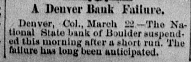 A Denver Bank Failure. Denver, Col., March 22-The National State bank of Boulder suspended this morning after a short run. The failure has long been anticipated.