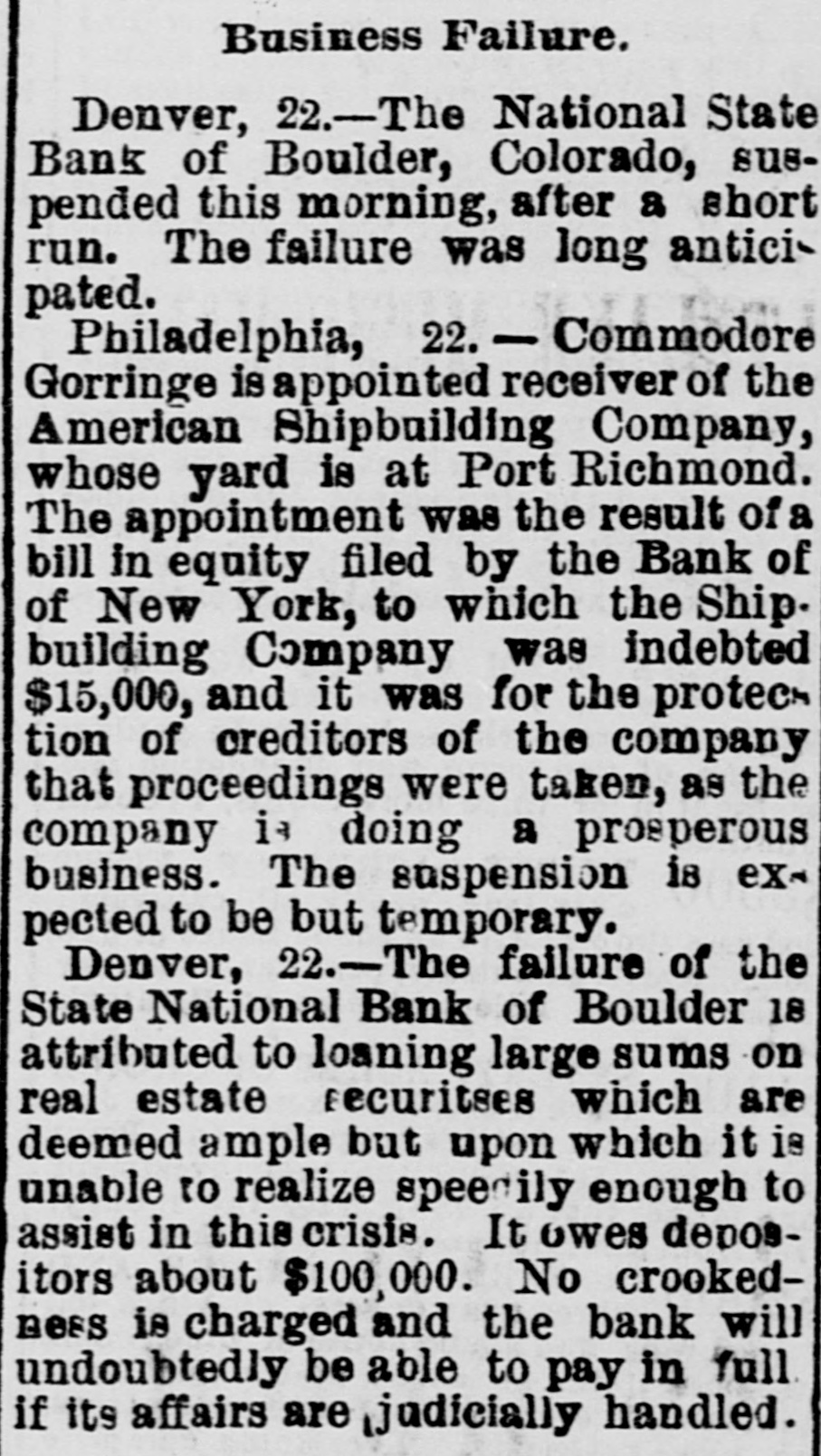 Business Failure. Denver, 22.-The National State Bank of Boulder, Colorado, suspended this morning, after a short run. The failure was long anticipated. Philadelphia, 22. - Commodore Gorringe is appointed receiver of the American Shipbuilding Company, whose yard is at Port Richmond. The appointment was the result of a bill in equity filed by the Bank of of New York, to which the Ship. building Company was indebted $15,000, and it was for the protecs tion of creditors of the company that proceedings were taken, as the company is doing a prosperous business. The suspension is ex~ pected to be but temporary. Denver, 22.-The failure of the State National Bank of Boulder 18 attributed to loaning large sums on real estate securitses which are deemed ample but upon which it is unable to realize speedily enough to assist in this crisis. It owes depositors about $100,000. No crookedness is charged and the bank will undoubtedly be able to pay in full if its affairs are judicially handled.