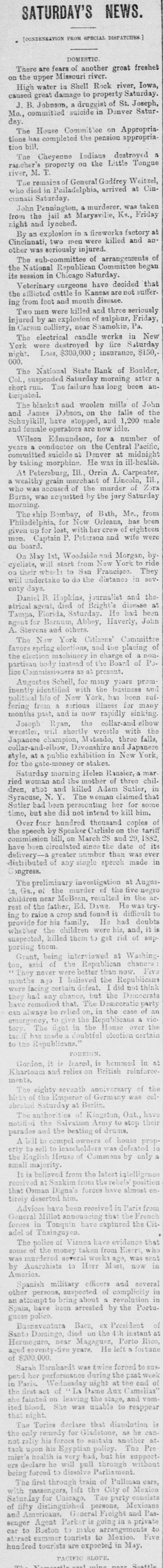 SATURDAY'S NEWS. [CONDENSATION FROM SPECIAL DISPATCHES.] DOMESTIC There are fears of another great freshet on the upper Missouri river. High water in Shell Rock river, Iowa, caused great damage to property Saturday. J. B. Johnson, druggist of St. Joseph, Mo., committed suicide in Denver Saturday. The House Committee on Appropriations has completed the pension appropria tion bill. Tae Cheyenne Indians destroyed a rancher's property on the Little Tongue river, M. T. The remains of General Godfrey Weitzel, who died in Pailadelphia, arrived at Cincinnati Saturday. John Pennington, murderer, was taken from the jail at Marysville, Ks., Friday night and lynched. By an explosion in fireworks factory at Cincinnati, two men were killed and an other was seriously injured. The sub-committee of arrangements of the National Republican Committee began its session in Chicago Saturday. Veterinary surgeons have decided that the afficted cattle in Kansas are not suffering from foot and mouth disease. Two men were killed and three seriously injured by an explosion of sulphur, Friday, in Carson colliery, near Shamokin, Pa. The electrical candle works in New York were destroyed by fire Saturday night. Loss, $300,000; insurance, $150,000. The National State Bank of Boulder, Col., suspended Saturday morning arter a short run. The failure has long been an. ticipated. The blanket and woolen mills of John and James Dobson, on the falls of the Schuylkill, have stopped, and 1,200 male and female operators are now idle. Wilson Edmundson, for a number of years conductor on the Central Pacific, committed suicide at Denver at midnight by taking morphine. He was in ill-health. At Petersburg, III., Orrin A. Carpenter, a wealthy grain merchant of Lincoln, III. who was accused of the murder of Burns, was acquitted by the jury Saturday morning. The ship Bombay, of Bath, Me., from Philadèlphia, for New Orleans, has been given up for lost, with her crew of eighteen men. Captain P. Peterson and wife were on board. On May 1st, Woodside and Morgan, by. cyclists, will start from New York to ride on their whe to San Francisco. They will undertake to do the distance in sev. enty days. Daniel B. Hopkins, journalist and the atrical agent, died of Bright's disease at Tampa, Florida, Saturday. He had been agent for Barnum, Abbey, Haverly, John A. Stevens and others. The New York Citizens' Committee favors spring elections, and the placing of the election machinery in charge of non. partisan body instead of the Board of Po. lice ommissioners as at present. Augustus Schell, for many years prom inently identified with the business AD: political life of New York, has been suf fering from a serious illness for many months past, and is now rapidly sinking Joseph Ryan, the collar-and elbow wrestler, will shortly wrestle with the Japanese champion, Matsado, three falls, collar-and-elbow, Devonshire and Japanese style, at public exhibition in New York, for the gate-money or stakes. Saturday morning Helen Ransier, a mar ried woman and the mother of three children, shot and killed Adam Sutler, in Syracuse, N. Y. The woman claimed that Sutler bad been persecuting her for some time, but she did not intend to kill him. Over four hundred thousand copies of the speech by Speaker Carlisle on the tariff commission bill, on March 28 and 29, 1882, have been circulated since the date of its delivery- greater number than was ever distributed of any single speech made in ongress. The preliminary investigation at Augusto, Ga., of the murder of the five negro children near McBean, resulted in the arrest of the father, Ed. Dawa He was try ing to raise crop and found it difficult to provide for his family. He had doubts whether the children were bis, and, it is suspected, killed them to get rid of sup porting them. Grant, being interviewed at Washing ton, said of the Republican chances " They never were better than now. Five month ago I believed the Republicans were facing certain defeat. I did not think they had any chance, but the Democrats have remadied that. The Democratic party can always be relied on, in the case of an emergency, to give the Republicans & victory. The fight in the House over the tar has made doubtful election certain to the Republicans. FOREIGN Gordon, it is feared, is hemmed in nt Khartoum and relies on British reinforce. ments. The eighty seventh anniversary of the birth of the Emperor of Germany was cel abrated Saturday at Berlin. The authori of Kingston, Ont., have notified the Salvation Army to stop their parades and the beating of drums. A bill to compel owners of house prop. erty to sell to leascholders was defeated in the English House of Commons by only a small majority. It is believed from the latest intelligence received at Snakim from the rebels position that Osman Digna's forces have almost en tirely deserted him. Advices have been received in Paris from General Millot announcing that the French forces in Tonquin have captured the Cit. adel of Thainguyen. The police of Vienca have evidence that some of the money taken from Eisert who was murdered several weeks ago, was sent by Auarchists to Herr Most, now in America. Spanish military officers and several other persons, suspected of complicity in an attempt to bring about a revolution in Spain, have been arrested by the Portu. guese police. Busnaventura Baez, ex President of Santo Domingo, died on the 4:h instant at Hermeguro, near Magaguez, Porto Rico, aged seventy years, He left a fortune of $200,000. Sarah Bernhardt was twice forced to suspend her performance during the past week in Paris. Wednesday night at the end of the first act of La Dame Aux Camelias she fainted on leaving the stage, and vom ited blood. She was unable to reappear that night. The Tories declare that dissolution is the only remody for Gladstone, as he can not rally his forces to sustain another at. tack upon his Egyptian policy. The Pre mier's health is very bad, but his support ers declare he will pull 