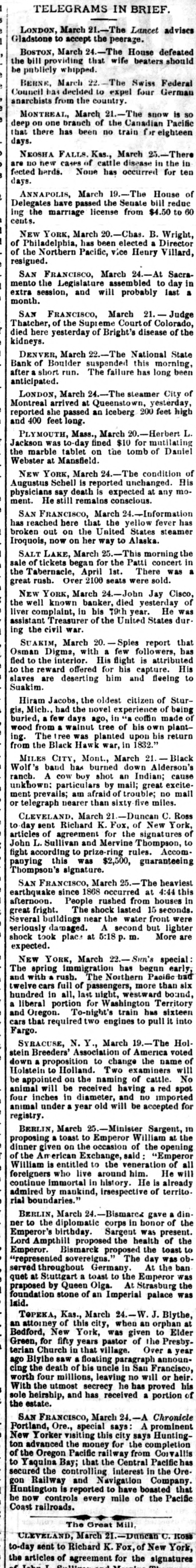 LONDON, March 21.-The Lancet advises Gladstone to accept the peerage. BOSTON, March 24.-The House defeated the bill providing that wife beaters should be publicly whipped. BERNE, March 22.-The Swiss Federal Council has decided to expel four German anarchists from the country. MONTREAL, March 21.-The snow is so deep on one branch of the Canadian Pacific that there has been no train for eighteen days. NEOSHA FALLS. Kas., March 25.-There are no new cases of cattle disease in the in fected herds. None has occurred for ten days. ANNAPOLIS, March 19.-The House of Delegates have passed the Senate bill reduc ing the marriage license from $4.50 to 60 cents. NEW YORK, March 20.-Chas. B. Wright, of Philadelphia, has been elected a Director of the Northern Pacific, vice Henry Villard, resigned. SAN FRANCISCO, March 24.-At Sacramento the Legislature assembled to day in extra session, and will probably last a month. SAN FRANCISCO, March 21.-Judge Thatcher, of the Supreme Courtof Colorado, died here yesterday of Bright's disease of the kidneys. DENVER, March 22.-The National State Bank of Boulder suspended this morning, after a short run. The failure has long been anticipated. LONDON, March 24.-The steamer City of Montreal arrived at Queenstown, yesterday, reported she passed an iceberg 200 feet high and 400 feet long. PLYMOUTH, Mass., March 20.-Herbert L. Jackson was to-day fined $10 for mutilating the marble tablet on the tomb of Daniel Webster at Mansfield. NEW YORK, March 24.-The condition of Augustus Schell is reported unchanged. His physicians say death is expected at any moment. He still remains conscious. SAN FRANCISCO, March 24.-Information has reached here that the yellow fever has broken out on the United States steamer Iroquois, now on her way to Alaska. SALT LAKE, March 25.-This morning the sale of tickets began for the Patti concert in the Tabernacle, April 1st. There was a great rush. Over 2100 seats were sold. NEW YORK, March 24.-John Jay Cisco, the well known banker, died yesterday of liver complaint, in his 79th year. He was assistant Treasurer of the United States dur. ing the civil war. SUAKIM, March 20.-Spies report that Osman Digma, with a few followers, has fled to the interior. His flight is attributed to the reward offered for his capture. His slaves are deserting him and fleeing to Suakim. Hiram Jacobs, the oldest citizen of Sturgis, Mich., had the novel experience of being buried, a few days ago, in "a coffin made of wood from & walnut tree of his own planting. The tree was planted upon his return from the Black Hawk war, in 1832." MILES CITY, Mont., March 21. Black Wolf's band has burned down Alderson's ranch. A cow buy shot an Indian; cause unkhown: particulars by mail; great excitement prevails; am afraid of trouble; no mail or telegraph nearer than sixty five miles. CLEVELAND. March 21.-Duncan C. Ross to day sent Richard K. Fox, of New York, articles of agreement for the signatures of John L. Sullivan and Mervine Thompson, to fight according to prize-ring rules. Accompanying this was $2,500, guaranteeing Thompson's signature. SAN FRANCISCO, March 25.-The heaviest earthquake since 1868 occurred at 4:44 this afternoon. People rushed from houses in great fright. The shock lasted 15 seconds. Several buildings near the water front were seriously damaged. A second but lighter shock took place at 5:18 p. m. More are expected. NEW YORK, March 22.-Sun's special: The spring immigration has begun early, and with a rush. The Northern Pacific had twelve cars full of passengers, more than six hundred in all, last night, westward bound, a liberal portion for Washington Territory and Oregon. To-night's train has sixteen cars that required two engines to pull it into Fargo. SYRACUSE, N. Y., March 19.-The Holstein Breeders' Association of America voted down a proposition to change the name of Holstein to Holland. Two examiners will be appointed on the naming of cattle. No animal will be received having a red spot four inches in diameter, and no imported animal under a year old will be accepted for registry. BERLIN, March 25.-Minister Sargent, in proposing a toast to Emperor William at the dinner given on the occasion of the opening of the American Exchange, said "Emperor William is entitled to the veneration of all foreigners who live around him. He will continue immortal in history. He is already admired by mankind, irsespective of territo. rial boundaries." BERLIN, March 24.-Bismarca gave a din ner to the diplomatic corps in bonor of the Emperor's birthday. Sargent was present. Lord Ampthill proposed the health of the Emperor. Bismarck proposed the teast to "represented sovereigns." The day was observed throughout Germany. At the ban quet at Stuttgart a toast to the Emperor was praposed by Queen Olga. At Strasburg the foundation stone of an Imperial palace was laid. TOPEKA, Kas., March 24.-W. J. Blythe, an attorney of this city, when an orphan at Bedford, New York, was given to Elder Green, for fifty years pastor of the Presbyterian Church in that village. Over a year ago Blyihe saw a floating paragraph announcing the death of bis uncle in San Francisco, worth four millions, leaving no will or heir. With the utmost secrecy he has proved his sole heirship, and has received a portion of the estate. SAN FRANCISCO, March 24.-A Chronicle Portland, Ore., special says: A prominent New Yorker visiting this city says Huntington advanced the money for the completion of the Oregon Pacific railway from Corvallis to Yaquina Bay; that the Central Pacific has secured the controlling interest in the Oregon Railway and Navigation Company. Huntington is reported to have boasted that he now controls every mile of the Pacific Coast railroads.