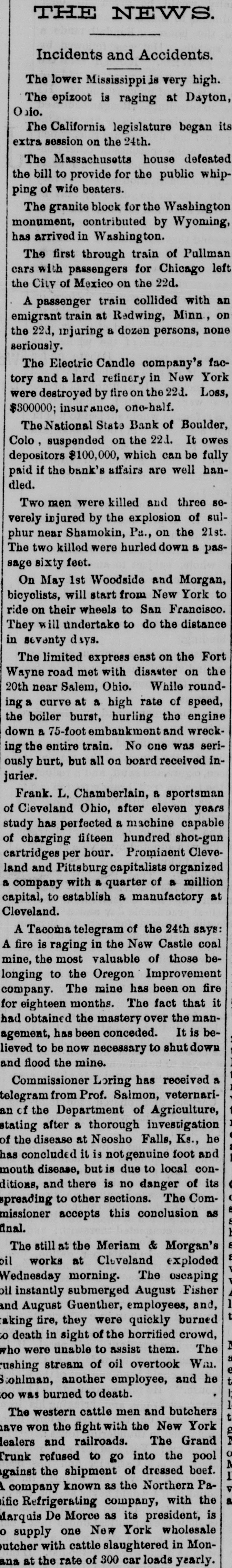 THE NEWS. Incidents and Accidents. The lower Mississippi. is very high. The epizoot is raging at Dayton, Ohio. The California legislature began its extra session on the 24th. The Massachusetts house defeated the bill to provide for the public whipping of wife beaters. The granite block for the Washington monument, contributed by Wyoming, has arrived in Washington. The first through train of Pullman cars with passengers for Chicago left the City of Mexico on the 22d. A passenger train collided with an emigrant train at Redwing, Minn, on the 22d, injuring a dozen persons, none seriously. The Electric Candle company's factory and a lard refinery in New York were destroyed by fire on the 22d. Loss, $300000; insur ance, one-half. The National State Bank of Boulder, Colo, suspended on the 22.1. It owes depositors $100,000, which can be fully paid if the bank's affairs are well handled. Two men were killed and three severely injured by the explosion of sulphur near Shamokin, Pa., on the 21st. The two killed were hurled down a passage sixty feet. On May 1st Woodside and Morgan, bicyclists, will start from New York to ride on their wheels to San Francisco. They will undertake to do the distance in seventy days. The limited express east on the Fort Wayne road met with disaster on the 20th near Salem, Ohio. While rounding a curve at a high rate of speed, the boiler burst, hurling the engine down a 75-foot embankment and wrecking the entire train. No one was seriously hurt, but all on board received injurier. Frank. L, Chamberlain, a sportsman of Cleveland Ohio, after eleven years study has perfected a machine capable of cartridges charging per fifteen hour. hundred Prominent shot-gun Cleveland and Pittsburg capitalists organized a company with a quarter of a million capital, to establish a manufactory at Cleveland. A Tacoma telegram of the 24th says: A fire is raging in the New Castle coal mine, the most valuable of those belonging to the Oregon Improvement company. The mine has been on fire for eighteen months. The fact that it had obtained the mastery over the management, has been conceded. It is believed to be now necessary to shut down and flood the mine. Commissioner Loring has received telegram from Prof. Salmon, veternarian of the Department of Agriculture, stating after a thorough investigation of the disease at Neosho Falls, Ks., he has concluded it is not genuine foot and mouth disease, but is due to local conditions, and there is no danger of its spreading to other sections. The Commissioner accepts this conclusion as final. The still at the Meriam & Morgan's oil works at Cleveland exploded Wednesday morning. The oscaping oil instantly submerged August Fisher and August Guenther, employees, and, taking tire, they were quickly burned to death in sight of the horrified crowd, who were unable to assist them. The rushing stream of oil overtook Wai. Stohlman, another employee, and he 00 was burned to death. 1 The western cattle men and butchers have won the fight with the New York g dealers and railroads. The Grand Trunk refused to go into the pool gainst the shipment of dressed beef. company known as the Northern Paific Refrigerating company, with the Marquis De Morce as its president, is o supply one New York wholesale utcher with cattle slaughtered in Monana at the rate of 300 car loads yearly.