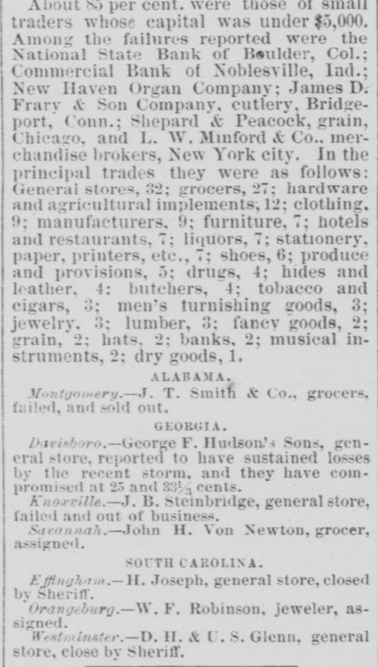 About 80 per cent. were those of small traders whose capital was under $5,000. Among the failures reported were the National State Bank of Boulder, Col.; Commercial Bank of Noblesville, Ind.; New Haven Organ Company; James D. Frary & Son Company, cutlery, Bridgeport, Conn.; Shepard & Peacock, grain, Chicago, and L. W. Minford & Co., merchandise brokers, New York city. In the principal trades they were as follows: General stores, 32; grocers, 27; hardware and agricultural implements, 12; clothing. 9; manufacturers. 9; furniture, 7; hotels and restaurants, 7; liquors, 7; stationery, paper, printers, etc., 7; shoes, 6; produce and provisions, 5; drugs, 4; hides and leather, 4: butchers, 4; tobacco and cigars, 3; men's turnishing goods, 3; jewelry. 3; lumber, 3; fancy goods, 2; grain, 2; hats, 2; banks, 2; musical instruments, 2; dry goods, 1. ALABAMA. Montgomery.-J. T. Smith & Co., grocers, failed, and sold out. GEORGIA. Darisboro.-George F. Hudson's Sons, general store, reported to have sustained losses by the recent storm. and they have compromised at 25 and 33½ cents. Knowville.-J. B. Steinbridge, general store, failed and out of business. Savannah.-John H. Von Newton, grocer, assigned. SOUTH CAROLINA. E fingham.- H. Joseph, general store, closed by Sheriff. Orangeburg.-W. F. Robinson, jeweler, assigned. Westminster.-D. H. & U.S. Glenn, general store, close by Sheriff.