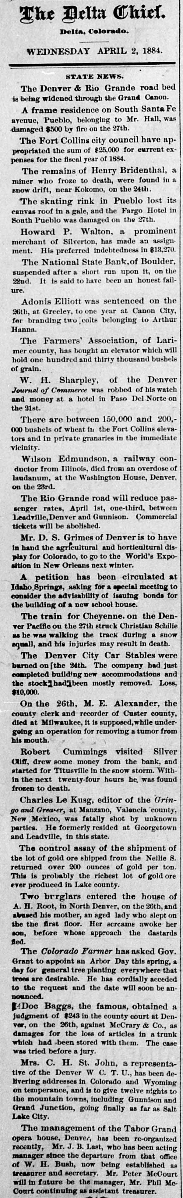 The Delta Chief. Delta. Colorado. WEDNESDAY APRIL 2, 1884. STATE NEWS. The Denver & Rio Grande road bed is being widened through the Grand Canon. A frame residence on South Santa Fe avenue, Pueblo, belonging to Mr. Hall, was damaged $500 by fire on the 27th. Collins apthe sum expropriated The Fort of city $25,000 council for current have penses for the fiscal year of 1884. The remains of Henry Bridenthal, a miner who froze to death, were found in a snow drift, near Kokomo, on the 24th. The skating rink in Pueblo lost its canvas roof in a gale, and the Fargo Hotel in South Pueblo was damaged on the 27th. Howard P. Walton, a prominent merchant of Silverton, has made an assignment. His preferred indebtedness in $13,270. The National State Bank of Boulder. suspended after a short run upon it, on the 22nd. It is said to have been an honest failure. Adonis Elliott was sentenced on the 26th, at Greeley, to one year at Canon City, for branding two (colts belonging to Arthur Hanna. The Farmers' Association, of Larimer county, has bought an elevator which will hold one hundred and thirty thousand bushels of grain. W. H. Sharpley, of the Denver Journal of Commerce was robbed of his watch and money at a hotel in Paso Del Norte on the 31st. There are between 150,000 and 200,000 bushels of wheat in the Fort Collins elevators and in private granaries in the immediate vicinity. Wilson Edmundson, a railway conductor from Illinois, died from an overdose of laudanum, at the Washington House, Denver. on the 23rd. The Rio Grande road will reduce passenger rates, April 1st, one-third, between Leadville, Denver and Gunnison. Commercial tickets will be abolished. Mr. D. S. Grimes of Denver is to have in hand the agricultural and horticultural display for Colorado, to go to the World's Exposition in New Orleans next winter. A petition has been circulated at Idaho,Springs, asking for a special meeting to consider the advisability of issuing bonds for the building of a new school house. The train for Cheyenne. on the Denver Pacific ou the 27th struck Christian Schilie as he was walking the track during a snow equall, and his injuries may result in death. The Denver City Car Stables were burned on [the 24th. The company had just completed building new accommodations and the stock]had'libeer mostly removed. Loss, $10,000. On the 26th, M. E. Alexander, the county clerk and recorder of Custer county, died at Milwaukee, it is supposed, while undergoing an operation for removing a tumor from his mouth. Robert Cummings visited Silver Cliff, drew some money from the bank, and started for Titusville in the snow storm. Within the next twenty-four hours he, was found frozen to death. Charles Le Kusg, editor of the Gringo at county, New was and Mexico, Greaer, Manzano, fatally shot Valencia by unknown parties. He formerly resided at Georgetown and Leadville, in this state. The control assay of the shipment of the lot of gold ore shipped from the Nellie S. returned over 200 ounces of gold per ton. This is probably the richest lot of gold ore ever produced in Lake county. Two burglars entered the house of A. on and abused an on H. Root, his mother, in North Denver, aged lady the who 26th, slept the the first floor. Her sercame awoke her son, before whose approach the dastards fled. The Colorado Farmer has asked Gov. Grant to appoint an Arbor Day this spring, a day for general tree planting everywhere that trees are desirable. He has cordially acceded to the request and the date will soon be announced. 44oo Baggs, the famous, obtained a judgment of $243 in the county court at Denver, on & as a trunk damages the for been 26th, the against loss of articles McCrary in Co., which had stored with them. The case was tried before a jury. Mrs. C. H. St. John, a representative been deon to livering temperance, of the addresses Denver and in is W Colorado to C. give T. twelve U., and has Wyoming nights the mountain towns, including Gunnison and Grand Junction, going finally as far as Salt Lake City. The management of the Tabor Grand opera house, Denver, has been re-organized office manager recently, since Mr. J. the B. departure Last, who from has been that acting of W. H. Bush, now being established as treasurer and secretary. Mr. Peter McCourt will in future be the manager, Mr. Phil McCourt continuing as assistant treasurer.
