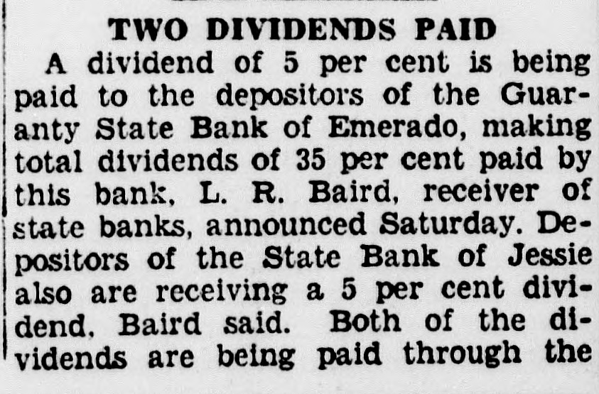 TWO DIVIDENDS PAID A dividend of 5 per cent is being paid to the depositors of the Guaranty State Bank of Emerado, making total dividends of 35 per cent paid by this bank, L. R. Baird, receiver of state banks, announced Saturday. Depositors of the State Bank of Jessie also are receiving a 5 per cent dividend. Baird said. Both of the dividends are being paid through the