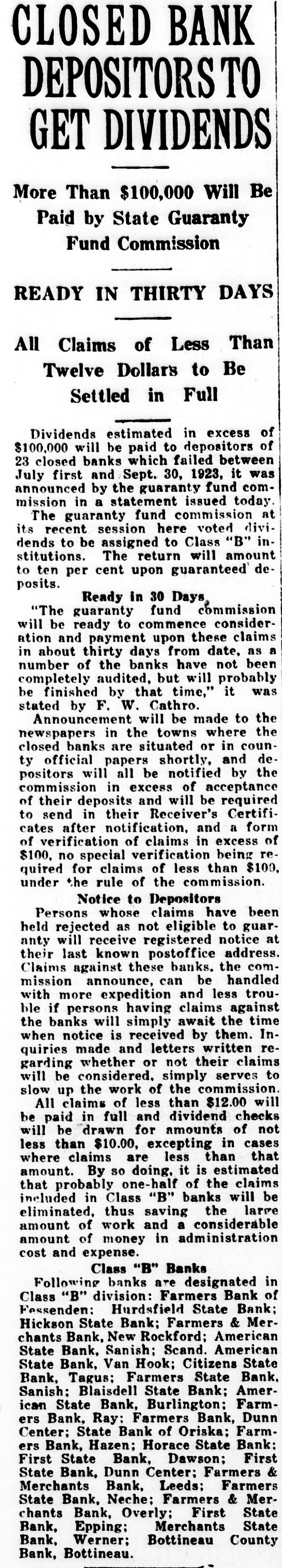 CLOSED BANK DEPOSITORS TO GET DIVIDENDS More Than $100,000 Will Be Paid by State Guaranty Fund Commission READY IN THIRTY DAYS All Claims of Less Than Twelve Dollars to Be Settled in Full Dividends estimated in excess of $100,000 will be paid to depositors of banks which first and Sept. 30, was July 23 closed failed 1923, between it the guaranty coma statement announced mission in by commission issued fund today fund at its session here The recent guaranty voted "B" divi- indends to be assigned to Class stitutions. The return will amount to ten per cent upon guaranteed deposits. Ready in 30 Days, fund commission will to commence "The be guaranty ready these consider- claims upon days as a the banks have ation in number about and of thirty payment from date. not been completely audited, but will probably be finished by that time," it was stated F. W. Cathro. will be the Announcement by made where to the newspapers in the towns closed banks are situated or in counofficial papers shortly, and dewill all be in excess ty commission positors notified of be acceptance by the of and will to their Receiver's their send deposits in required Certifi- form cates after notification, and a of verification of claims in excess of $100, no special verification being required for claims of less than $100. under the rule of the commission. Notice to Depositors Persons whose claims have been held as not guaranty will receive at rejected registered eligible notice to address. known postoffice these comcan their mission Claims last against announce, banks. be the handled ble having with if more persons expedition claims and less the against trou- time the will simply await is received Inwhen banks notice letters by written them. made and rewhether or not considered. serves will garding quiries be simply their claims to slow the work of the of less than All up claims commission. $12.00 will be in full and will for not paid be drawn amounts dividend in of checks than $10.00, excepting cases are less so doing, it is less where amount. claims By than estimated that one-half "B" be included that probably in Class banks of the the will claims large thus saving work and a amount eliminated, of administration considerable amount of money in cost and expense. Class "B" Banks banks are in division: Farmers of Following "B" designated Bank Hurdsfield State Bank; Hickson Fessenden: Class Farmers State American & Bank: MerNew Rockford; Sanish; State Van Hook; chants State Bank, Bank, Bank, Scand. Citizens American State Bank, Tagus; Farmers State Bank. Sanish: Blaisdell State Bank; AmerBank, Burlington; Farmers State Bank of ers ican Bank, State Ray: Oriska; Bank, Farm- Farm- Dunn Hazen; Horace First Bank, ers Center; Bank, State Dawson; State Bank: First State Bank, Dunn Center: Farmers & Merchants Bank, Leeds; Farmers State Bank, Neche: Farmers & Merchants Bank, Overly; First State Bank, Epping: Merchants State Bank. Werner; Bottineau County Bank, Bottineau.