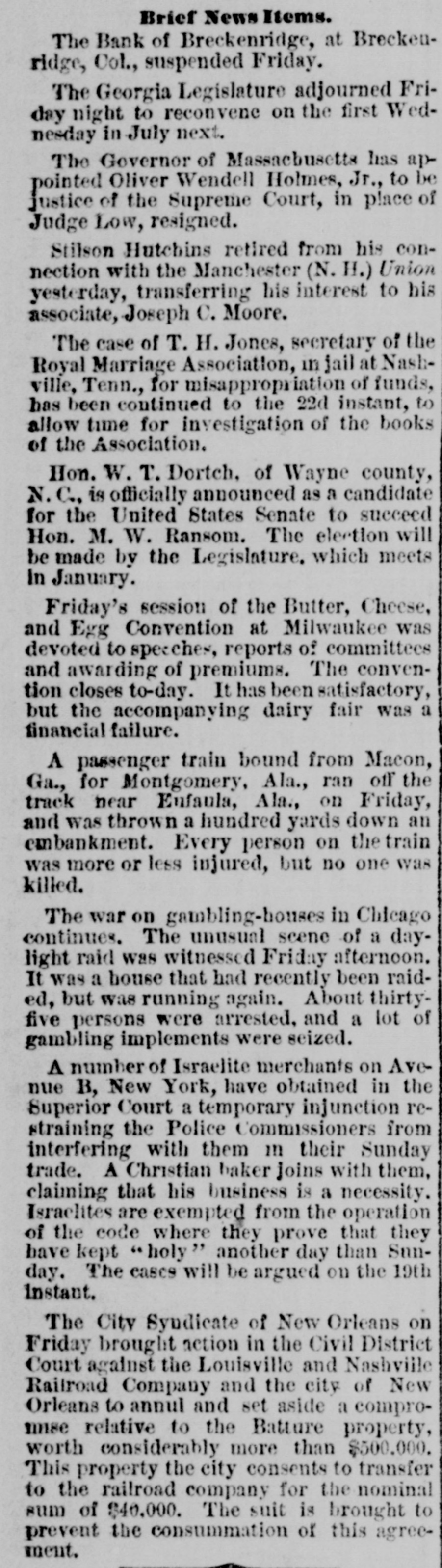 BRIEF NEWS SUMMARY. Marshal MacMahon is reported seriously ill. In the Chamber of Deputies yesterday the budget was adopted by a vote of 454 to 46. The bark Anders Dedekan, from Stettin for Charleston, has been damaged in collision and has been ashore. Albert Sanders, colored, was hanged at Charleston, Mo., yesterday, for the murder of Moses Wing, also colored. The Bank of Breckenridge, at Breckenridge, Colorado, suspended yesterday morning. It was a small concern. Official returns of the vote for Governor in New Hampshire give Hale, Republican, 38,417: Edgerly, Democrat, 36,919; scattering, 936; Hale's majority, 542. Hong Ah Duck was executed at Fair Rafare, Cal., yesterday. The murderer was an inmate of the penitentiary, and in October, 1880, he stabbed to death a fellow Chinese convict. The Chambers of Commerce of all the seaports of Germany have protested against the exclusion of American pork. The government, however, will persevere in their determination to prohibit its importation. The Dublin Freeman's Journal says: "Davitt intends to subpoena Mr. Gladstone and Mr. Trevelyan, Chief Secretary for Ireland, to depose at his trial as to the influence of the agitation in Ireland on the passage of the land bill. In the star route trials, yesterday was spent in argument as to the number of peremptory challenges to be allowed each side in forming the jury. Judge Wylie adjourned the court at the close of the argument, and will announce his decision on Monday, The paint shop and car shed of the Richmond and Danville Railroad Company, on the south side of James river, opposite Richmond, Va., was burned last night. Also one passenger coach and express car. The foundry was also damaged. The total loss is about $10,000. Insured. A Donaldsonville, Louisiana, speeial says that Gustave Paul was changed in the jail yard at twelve minutes past one yes. terday afternoon. Two thousand people witnessed the execution. Paul made a short speech, saying he was ready to go. He was executed for the murder of Eve Thompson. Yesterday morning a fire at the works of the Sagmaw Barrel Company destroyed the factory, saw mill, drill house, a large quantity of the products of the works and about two million feet of lumber. The loss will approximate $175,000, and is understood to be fully insured. One hundred and fifty men are thrown out of employment. The city syndicate of New Orleans yesterday brought an action in the Civil District Court against the Louisville and Nashville Railroad Company and the city of New Orleans to annul and set aside the compromise relative to the Batture property, worth considerably more than half a million dollars. This property the city consented to transfer to the railroad company for the nominal sum of forty thousand dollars, The suit is brought to prevent the consumination of this agreement.