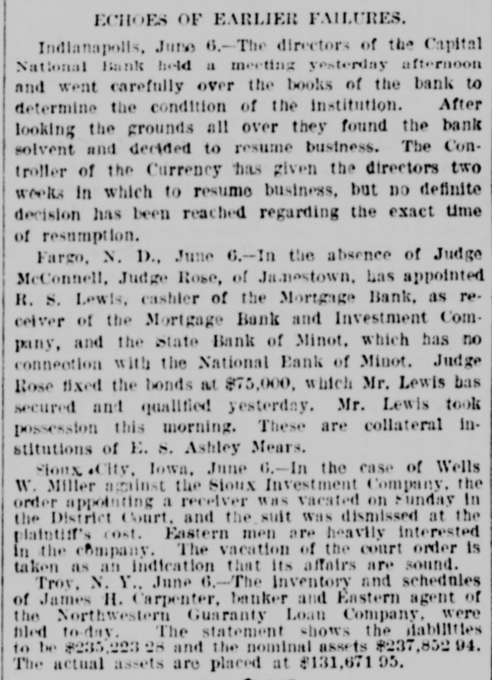ECHOES OF EARLIER FAILURES. Indianapolls, June 6.-The directors of the Capital National Bank held a meeting yesterday afternoon and went carefully over the books of the bank to determine the condition of the institution. After looking the grounds all over they found the bank solvent and decided to resume business. The Controller of the Currency has given the directors two weeks in which to resume business, but no definite decision has been reached regarding the exact time of resumption. Fargo, N. D., June 6.-In the absence of Judge McConnell, Judge Rose, of Jamestown, has appointed R. S. Lewis, cashier of the Mortgage Bank, as receiver of the Mortgage Bank and Investment Company, and the State Bank of Minot. which has no connection with the National Bank of Minot. Judge Rose fixed the bonds at $75,000, which Mr. Lewis bas secured and qualified yesterday. Mr. Lewis took possession this morning. These are collateral institutions of E. S. Ashley Mears. Floux City, Iown. June 6.-In the case of Wells W. Miller against the Sioux Investment Company, the order appointing a receiver was vacated on Funday In the District Court. and the suit was dismissed at the platntiff's cost. Eastern men are heavily interested In the company. The vacation of the court order is taken as an indication that its affairs are sound. Troy, N. Y., June 6.-The Inventory and schedules of James H. Carpenter, banker and Eastern agent of the Northwestern Guaranty Loan Company, were filed to-day. The statement shows the liabilities to be $235,223 2 and the nominal assets $237,852 94. The actual assets are placed at $131,671 95.