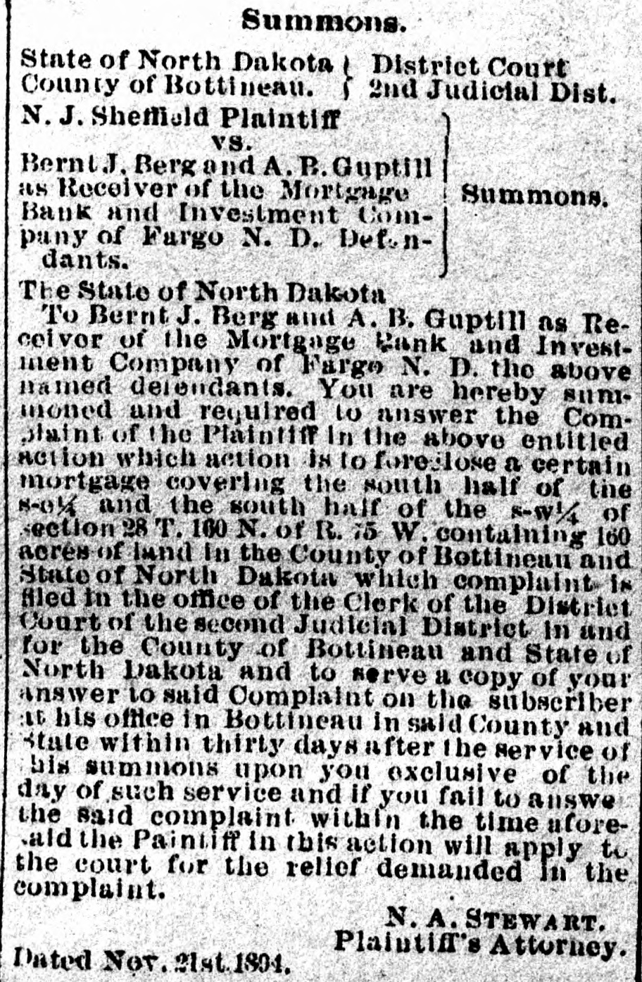 Summons. State of North Dakota District Court County of Bottineau. 2nd Judicial Dist. N. J. Sheffield Plaintiff vs. Bernt Berg and A. B. Guptill as Receiver of the Mortgage Summons. Bank and Investment Company of Fargo N. D. Defondants. The State of North Dakota To Bernt J. Berg and A. B. Guptill as Receiver of the Mortgage Bank and Investment Company of Fargo N. D. the above named defendants. You are hereby summoned and required to answer the Complaint of the Plaintiff In the above entitled action which action is to foreilose a certain mortgage covering the south half of the 8-0% and the south half of the s-wi/4 of section 28 T. 160 N. of R. 15 W. containing 160 acrés of land in the County of Bottineau and State of North Dakota which complaint is filed in the office of the Clerk of the District Court of the second Judicial District in and for the County of Bottineau and State of North Dakota and to serve a copy of your answer to said Complaint on the subscriber 11 his office in Bottineau in said County and State within thirty days after the service of bis summons upon you exclusive of the day of such service and if you fail to answe the said complaint within the time afore.ald the Paintiff in this action will apply to the court for the relief demanded in the complaint. N. A. STEWART. Plaintiff's A ttorney. Dated Nov. 21st.1804.
