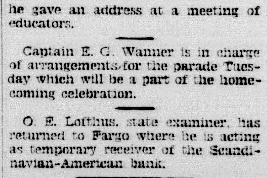 he gave an address at a meeting of educators. Captain E. G. Wanner is in charge of arrangements/for the parade Tuesday which will be a part of the homecoming celebration. O. E. Lofthus. state examiner. has returned to Fargo where he is acting as temporary receiver of the Scandinavian-American bank.