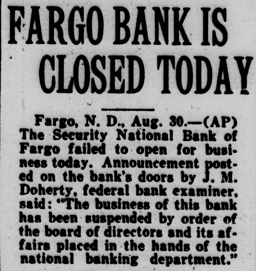 Ada Bank Closing The closing of the State bank of with of close to was by voluntary action of the board of directors, fol. lowing the closing of the Security National of The report of closing of the Fargo bank in something on the Ada yesterday was Forum today by Brandvold of Fergus state bank has been placed in charge of the Ada bank. Mr. Brandvold took charge today from A. Veigel, state banks. The hoard of directors of the Ada bank met late and decided to ask that the state banking department there. James Grady. president, and H. C. Anmoth. vicepresident of the Security National bank of Fargo, held the in the Security State bank of Valley City Situation It was reported today that the situ ation at Valley City to be well in The word of the ing of the Security National of Fargo caused at Valley City Thursday and number started Prompt action bank officials in public statements that they prepared to pay all depositors in full checked the The following telegram to the First and Security National bank of Valley City from the First National was made public late Thursday "Shipping you currency through the Federal Reserve bank tonight. forward you additional If need Don't heslcurrency you tate to wire we can be of any of the ley City