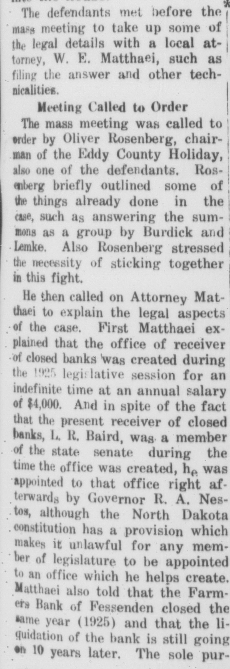 The defendants met before the mass meeting to take up some of the legal details with a local attorney, W. E. Matthaei, such as filing the answer and other technicalities. Meeting Called to Order The mass meeting was called to order by Oliver Rosenberg, chairman of the Eddy County Holiday, also one of the defendants. Rosenberg briefly outlined some of the things already done in the case, such as answering the summons as a group by Burdick and Lemke. Also Rosenberg stressed the necessity of sticking together in this fight. He then called on Attorney Matthaei to explain the legal aspects of the case. First Matthaei explained that the office of receiver of closed banks was created during the 1925 legislative session for an indefinite time at an annual salary of $4,000. And in spite of the fact that the present receiver of closed banks, L. R. Baird, was. a member of the state senate during the time the office was created, he was appointed to that office right afterwards by Governor R. A. Nestos, although the North Dakota constitution has a provision which makes it unlawful for any member of legislature to be appointed to an office which he helps create. Matthaei also told that the Farmers Bank of Fessenden closed the same year (1925) and that the liguidation of the bank is still going on 10 years later. The sole pur-