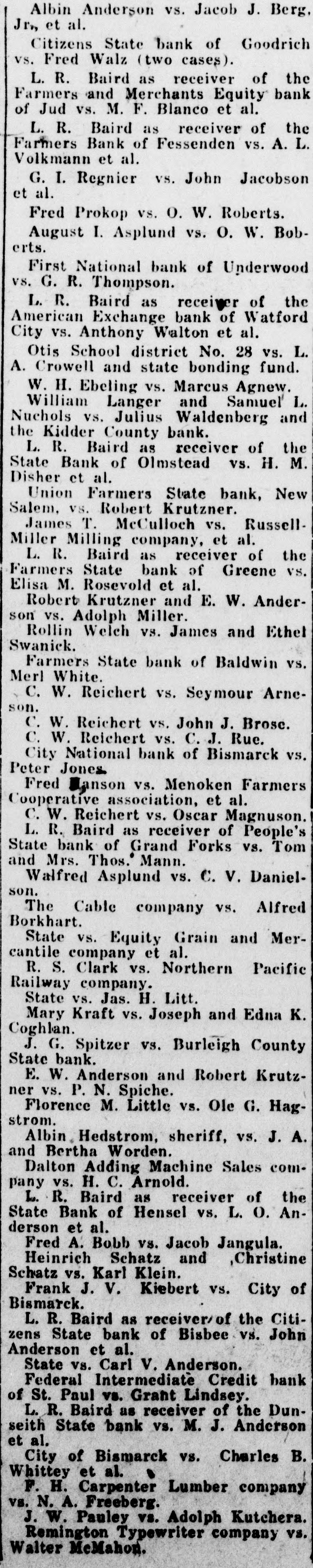 13 CRIMINAL CASES AND 112 CIVIL CASES ON CALENDAR FOR JUNE TERM OF BURLEIGH COUNTY DISTRICT COURT There are 13 criminal cases and 112 Albin Anderson vs. Jacob J. Berg, civil cases listed on the calendar Jrₙ et al. prepared by Clerk of Court Chas. Citizens State bank of Goodrich Pisher for the June term of district vs. Fred Walz (two cases). court in Burleigh county, which will L. R. Baird as receiver of the open at the court house in Bismarek Farmers and Merchants Equity bank on Tuesday, June 1, with Judge Fred of Jud vs. M. F. Blanco et al. Jansonius on the bench. Only the L. R. Baird as receiver of the setting of the calendar and various Farmers Bank of Fessenden vs. A. L. court matters will receive attention Volkmann et al. the first week, as the petit jurors have not been summoned to appear G. I. Regnier vs. John Jacobson et al. until Monday, June 7. in order that the farmers may have more time in Fred Prokop vs. O. W. Roberts. which to complete their spring work. August I. Asplund vs. O. W. BobOf the 13 criminal cases listed, erts. eight were on the previous calendar First National bank of Underwood and five are new cases. Three are vs. G. R. Thompson. alleged violations of the liquor laws, L. R. Baird as receiver of the two involve charges of operating a American Exchange bank of Watford motor vehicle while intoxicated, two City vs. Anthony Walton et al. of larceny, and one each of malicious mischief, assault and battery, reOtis School district No. 28 vs. L. moval of chattels subject to lien, and A. Crowell and state bonding fund. desertion. Two cases are entered W. H. Ebeling vs. Marcus Agnew. without designation as to their naWilliam Langer and Samuel L. ture. Nuchols vs. Julius Waldenberg and Criminal Cases the Kidder County bank. The criminal cases on the cafendar L. R. Baird as receiver of the are as follows: State Bank of Olmstead vs. H. M. Disher et al. State vs. F. E. Erickson, operating a motor vehicle while intoxicated. Union Farmers State bank, New Salem, vs. Robert Krutzner. State VS. Mrs. J. L. Finstad, engagJames T. McCulloch vs. Russelling in the liquor traffic. Miller Milling company, et al. State vs. Walter Carter, engaging L. R. Baird as receiver of the in the liquor traffic. Farmers State bank of Greene vs. State vs. Elwood Swanson, maliElisa M. Rosevold et al. cious mischief. Robert Krutzner and E. W. AnderState vs. Albert Little and Homer son vs. Adolph Miller. Taylor, larceny. Rollin Welch vs. James and Ethel State vs. L. Gramling, engaging in Swanick. the liquor traffic. Farmers State bank of Baldwin vs. State vs. Fred Hoff and Mrs. Fred Merl White. Hoff, assault and battery. State vs. Matt F. Schmitz, removC. W. Reichert vs. Seymour Arneson. ing chattels subject to lien. C. W. Reichert vs. John J. Brose. State vs. Albert Little, grand larC. W. Reichert vs. C. J. Rue. ceny. City National bank of Bismarck vs. State VS. Walter Millet, driving a Peter Jones. motor vehicle while intoxicated. Fred Janson vs. Menoken Farmers State vs. Gordon Conley, desertion Cooperative association, et al. and failure to support wife and minor child. C. W. Reichert vs. Oscar Magnuson. State vs. Wendlein Boehler. L. R. Baird as receiver of People's State bank of Grand Forks vs. Tom State vs. John Bashara. and Mrs. Thos.' Mann. Civil Cases Walfred Asplund vs. C. V. DanielFifty eight of the civil cases listed son. are from a former calendar, while 54 The Cable company vs. Alfred are new causes. The civil cases listBorkhart. ed include: State vs. Equity Grain and MerJ. A. and Bertha Worden vs. A. L. cantile company et al. Garnes and First State bank of ReR. S. Clark vs. Northern Pacific gran. Railway company. State vs. Jas. H. Litt. F. H. Carpenter Lumber company vs. W. G. Hoerr. Mary Kraft vs. Joseph and Edna K. John R. Kvile vs. E. F. and Alfhild Coghlan. Alfson. J. G. Spitzer vs. Burleigh County John A. Johnson vs. Thomas Hall. State bank. Farmers State bank of Regan vs. E. W. Anderson and Robert KrutzSevert Anderson and Anna Knutson. ner vs. P. N. Spiche. Henry Schmidt vs. North Dakota Florence M. Little vs. Ole G. HagWorkmen's Compensation Bureau. strom. State vs Bismarek Bank and Bank Albin. Hedstrom, sheriff, vs. J. A. of North Dakota. and Bertha Worden. State vs. Fred Bobb. Dalton Adding Machine Sales comPhillip Hemmerick vs. Farmers pany vs. H. C. Arnold. Elevator & Mercantile company. L. R. Baird as receiver of the Karem Husom vs. North Dakota State Bank of Hensel vs. L. O. AnWorkmen's Compensation bureau. derson et al. Carl Beyer vs. Stella Beyer. Fred A. Bobb vs. Jacob Jangula. L. R. Baird, receiver of Security Heinrich Schatz and Christine Bank of Leeds vs. E. B. Page and Schatz vs. Karl Klein. Henry Henrictta. Frank J. V. Kiebert vs. City of L. R. Baird as-receiver of the McBismarck. Kenzie County bank of Watford City L. R. Baird as receiver/o the Citivs. O. L. Cassady, et al. zens State bank of Bisbee vs. John H. M. Ward vs. Mandan Mercantile Anderson et al. company. State vs. Carl V. Anderson. L. R. Baird as receiver of the CitiFederal Intermediate Credit bank zens State bank of Hazen, VS E. M. of St. Paul vs. Grant Lindsey. Serr. L. R. Baird as receiver of the DunD. R. Baird as receiver of the First seith State bank vs. M. J. Anderson State bank of Nome vs. Carl P. et al. Miller. City of Bismarck vs. Charles B. L. R. Baird as receiver of the First Whittey et al. State bank of Fillmore vs. J. G: F. H. Carpenter Lumber company McClintock et al. vs. N. A. Freeberg. L. R. Baird as receiver of the Dazey J. W. Pauley vs. Adolph Kutchera. State bank of Dazey vs. E. B. JacobRemington Typewriter company vs. Walter MeMahon. son et al.