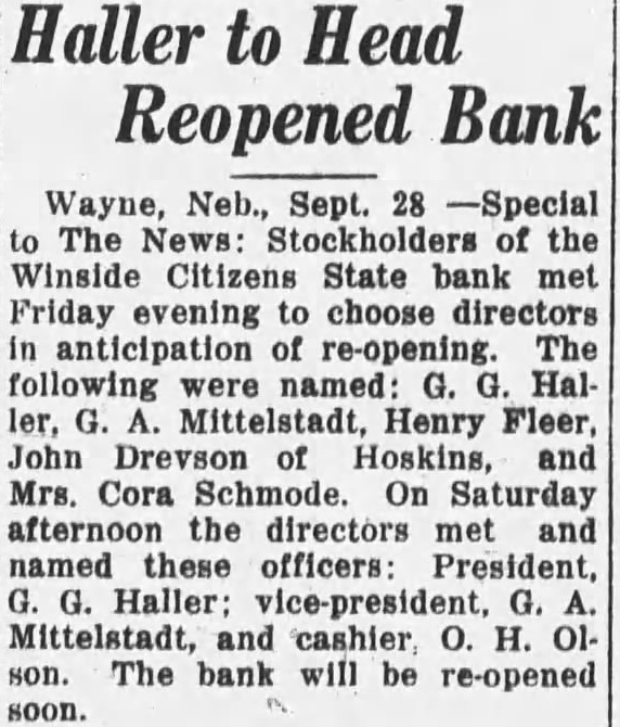 Haller to Head Reopened Bank Wayne, Neb., Sept. The News: Stockholders the Winside Citizens State bank met Friday evening to choose directors anticipation re-opening. The following named: HalMittelstadt, Henry Fleer, Drevson Hoskins, Cora Schmode. On Saturday afternoon the directors met and named these officers: President, Haller: vice-president, and cashier The bank will re-opened