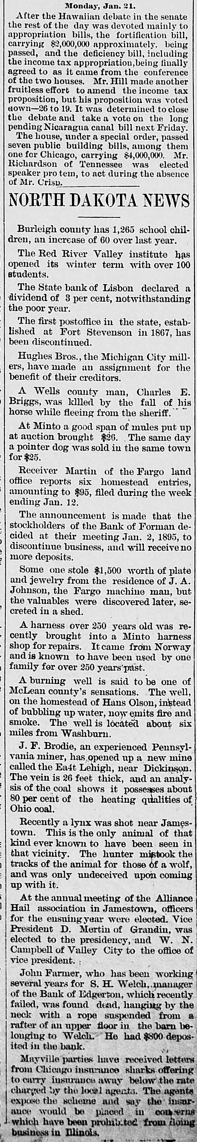 Monday, Jan. 21. After the Hawaiian debate in the senate the rest of the day was devoted mainly to appropriation bills, the fortification bill, carrying $2,000,000 approximately. being passed, and the deficiency bill, including the income tax appropriation, being finally agreed to as it came from the conference of the two houses. Mr. Hill made another fruitless effort to amend the income tax proposition, but his proposition was voted to was close a vote on the the down-26 debate and 19. It take determined to long pending canal next a The house, Nicaragua under special bill order, Friday. passed seven public building bills, among them one for Chicago, carrying $4,000,000. Mr. Richardson of Tennessee was elected speaker pro tem, to act during the absence of Mr. Crisp. NORTH DAKOTA NEWS Burleigh county has 1,265 school children, an increase of 60 over last year. The Red River Valley institute has opened its winter term with over 100 students. The State bank of Lisbon declared a dividend of 3 per cent, notwithstanding the poor year. The first postoffice in the state, established at Fort Stevenson in 1867, has been discontinued. Hughes Bros., the Michigan City millers, have made an assignment for the benefit of their creditors. A Wells county man, Charles E. Briggs, was killed by the fall of his horse while fleeing from the sheriff. a of mules up At auction Minto brought good span put at $26. The same day a pointer dog was sold in the same town for $25. Receiver Martin of the Fargo land office reports six homestead entries, amounting to $95, filed during the week ending Jan. 12. The announcement is made that the stockholders of the Bank of Forman decided at their meeting Jan. 2, 1895, to discontinue business, and will receive no more deposits. Some one stole $1,500 worth of plate and jewelry from the residence of J. A. Johnson, the Fargo machine man, but the valuables were discovered later, secreted in a shed. A harness over 250 years old was rebrought cently into a Minto harness shop for repairs. It came from Norway and is known to have been used by one family for over 250 years past. well is said to be one of McLean A burning county's sensations. The well, on the homestead of Hans Olson, instead emits fire and of bubbling up water, now smoke. The well is located about six miles from Washburn. J.F. Brodie, an experienced Peunsylvania miner, has opened up a new mine called the Ea4t Lehigh, near Dickinson. 26 feet and an The vein is thick, analysis shows it about 80 per cent the of of the coal of heating possesses qualities Ohio coal. Recently a lynx was shot near Jamestown. This is the only animal of that kind ever known to have been seen in that vicinity. The hunter mistook the for and tracks of the animal undeceived those of a wolf, was only upon coming up with it. At the annual meeting of the Alliance officers for were Hail the association ensuing yea in Jamestown, elected. Vice President D. Mertin of Grandin, was elected to the presidency, and W. N. Campbell of Valley City to the office of vice president. John Farmer, who has been working several years for S. H. Welch, manager of the Bank of Edgerton, which recently failed, was found dead, hanging by the neck with a rope suspended from a rafter of an upper floor in the barn belonging to Welch. He had $800 deposited in the bank. Mayville parties have received letters from Chicago insurance sharks offering to carry insurance away below the rate charged by the local agents. The agents expose the scheme and say the insurance would be placed in con erns which have been prohibited from doing business in Illinois.
