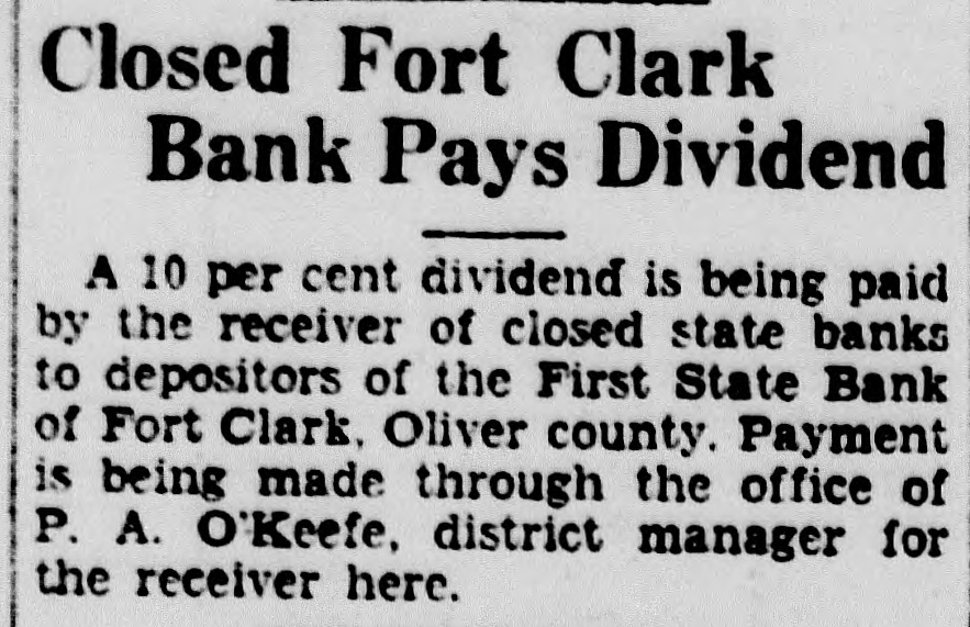 Closed Fort Clark Bank Pays Dividend A 10 per cent dividend is being paid by the receiver of closed state banks to depositors of the First State Bank of Fort Clark, Oliver county. Payment is being made through the office of P. A. O'Keete, district manager for the receiver here.