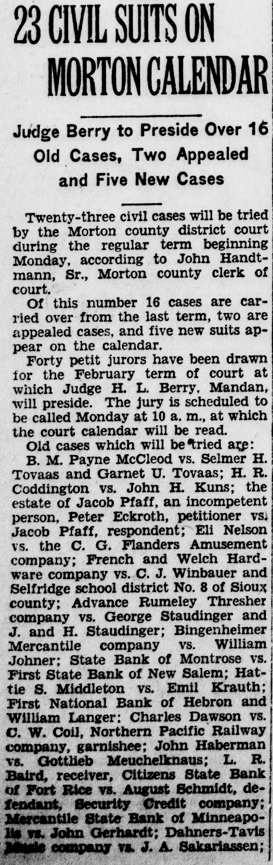# 23 CIVIL SUITS ON MORTON CALENDAR Judge Berry to Preside Over 16 Old Cases, Two Appealed and Five New Cases Twenty-three civil cases will be tried by the Morton county district court during the regular term beginning Monday, according to John Handtmann, Sr., Morton county clerk of court. Of this number 16 cases are carried over from the last term, two are appealed cases, and five new suits appear on the calendar. Forty petit jurors have been drawn for the February term of court at which Judge H. L. Berry, Mandan, will preside. The jury is scheduled to be called Monday at 10 a. m., at which the court calendar will be read. Old cases which will be tried are: B. M. Payne McCleod vs. Selmer H. Tovaas and Garnet U. Tovaas; H. R. Coddington vs. John H. Kuns; the estate of Jacob Pfaff, an incompetent person, Peter Eckroth, petitioner vs. Jacob Pfaff, respondent; Eli Nelson vs. the C. G. Flanders Amusement company; French and Welch Hardware company vs. C. J. Winbauer and Selfridge school district No. 8 of Sioux county; Advance Rumeley Thresher company vs. George Staudinger and J. and H. Staudinger; Bingenheimer Mercantile company vs. William Johner; State Bank of Montrose vs. First State Bank of New Salem; Hattie S. Middleton vs. Emil Krauth; First National Bank of Hebron and William Langer: Charles Dawson vs. C. W. Coil, Northern Pacific Railway company, garnishee; John Haberman vs. Gottlieb Meuchelknaus; L. R. Baird, receiver, Citizens State Bank of Fort Rice vs. August Schmidt, defendant, Security Credit company; Mercantile State Bank of Minneapolis vs. John Gerhardt; Dahners-Tavis Music company vs. J. A. Sakariassen;