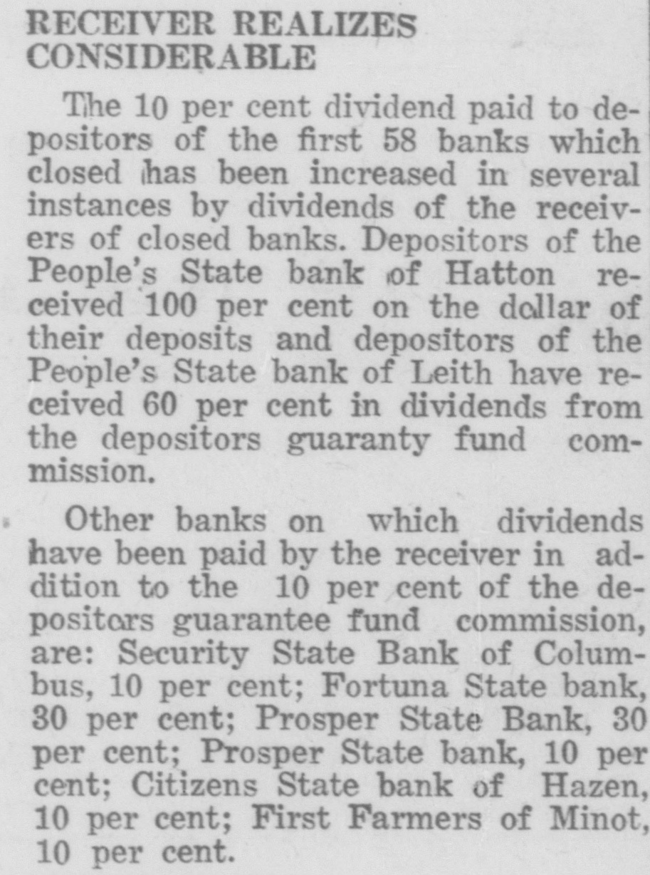 RECEIVER REALIZES CONSIDERABLE The 10 per cent dividend paid to depositors of the first 58 banks which closed has been increased in several instances by dividends of the receivers of closed banks. Depositors of the People's State bank of Hatton received 100 per cent on the dellar of their deposits and depositors of the People's State bank of Leith have received 60 per cent in dividends from the depositors guaranty fund commission. Other banks on which dividends have been paid by the receiver in addition to the 10 per cent of the depositars guarantee fund commission, are: Security State Bank of Columbus, 10 per cent; Fortuna State bank, 30 per cent; Prosper State Bank, 30 per cent; Prosper State bank, 10 per cent; Citizens State bank of Hazen, 10 per cent; First Farmers of Minot, 10 per cent.