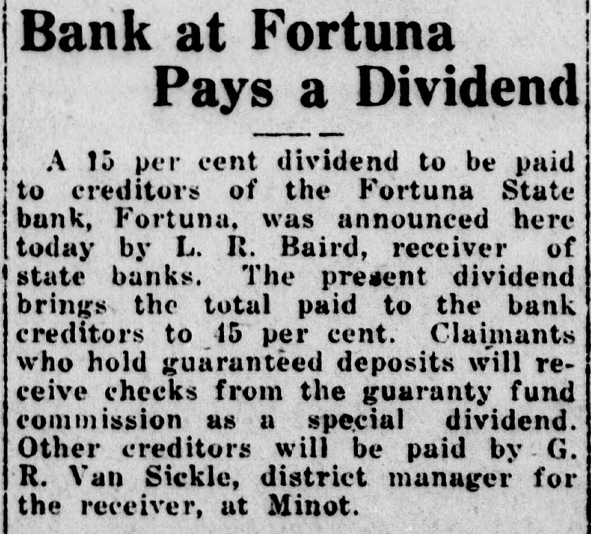 Bank at Fortuna Pays a Dividend A 15 per cent dividend to be paid to creditors of the Fortuna State bank, Fortuna, was announced here today by L. R. Baird, receiver of state banks. The present dividend brings the total paid to the bank creditors to 15 per cent. Claimants who hold guaranteed deposits will receive checks from the guaranty fund commission as a special dividend. Other creditors will be paid by G. R. Van Sickle, district manager for the receiver, at Minot.