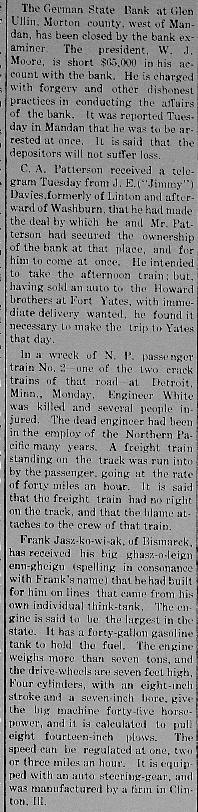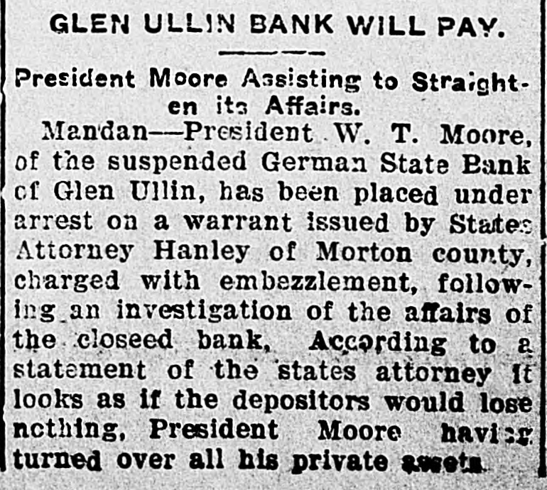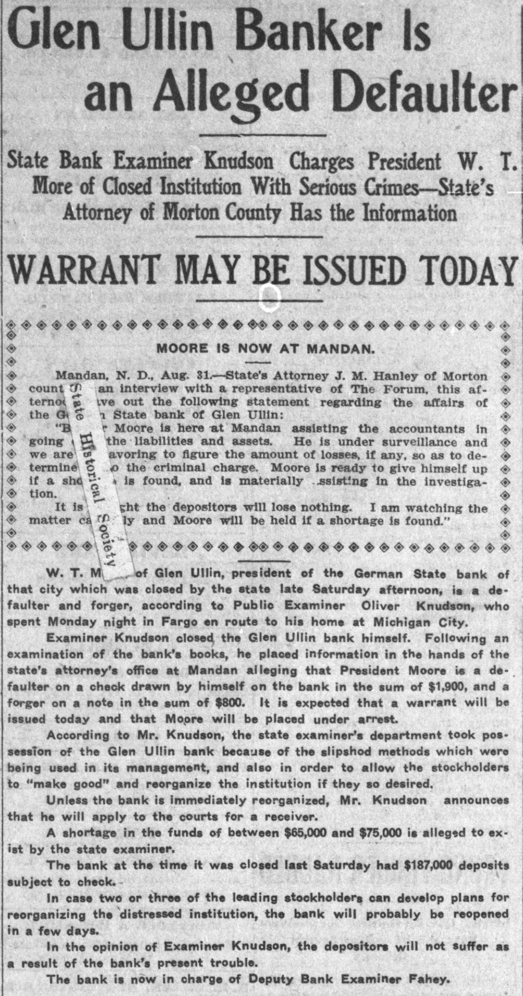Glen Ullin Banker Is an Alleged Defaulter State Bank Examiner Knudson Charges President W. T. More of Closed Institution With Serious Crimes-State's Attorney of Morton County Has the Information WARRANT MAY BE ISSUED TODAY MOORE IS NOW AT MANDAN. Mandan, N. D., Aug. 31.-State's Attorney J. M. Hanley of Morton count an interview with a representative of The Forum, this afive out the following statement regarding the affairs of State bank of Glen Ullin: Moore is here at Mandan assisting the accountants in the liabilities and assets. He is under surveillance and going we are avoring to figure the amount of losses, if any, so as to determine the criminal charge. Moore is ready to give himself up if a shd is found, and is materially .ssisting in the investigation. It is ght the depositors will lose nothing. I am watching the matter ca ly and Moore will be held if a shortage is found." W. T. M of Glen Ullin, president of the German State bank of that city which was closed by the state late Saturday afternoon, is a defaulter and forger, according to Public Examiner Oliver Knudson, who spent Monday night in Fargo en route to his home at Michigan City. Examiner Knudson closed the Glen Ullin bank himself. Following an examination of the bank's books, he placed information in the hands of the state's attorney's office at Mandan alleging that President Moore is a defaulter on a check drawn by himself on the bank in the sum of $1,900, and a forger on a note in the sum of $800. It is expected that a warrant will be issued today and that Moore will be placed under arrest. According to Mr. Knudson, the state examiner's department took pos. session of the Glen Ullin bank because of the slipshod methods which were being used in its management, and also in order to allow the stockholders to "make good" and reorganize the institution if they so desired. Unless the bank is immediately reorganized, Mr. Knudson announces that he will apply to the courts for a receiver. A shortage in the funds of between $65,000 and $75,000 is alleged to exist by the state examiner, The bank at the time it was closed last Saturday had $187,000 deposits subject to check. In case two or three of the leading stockholders can develop plans for reorganizing the distressed institution, the bank will probably be reopened in a few days. In the opinion of Examiner Knudson, the depositors will not suffer as a result of the bank's present trouble. The bank is now in charge of Deputy Bank Examiner Fahey.