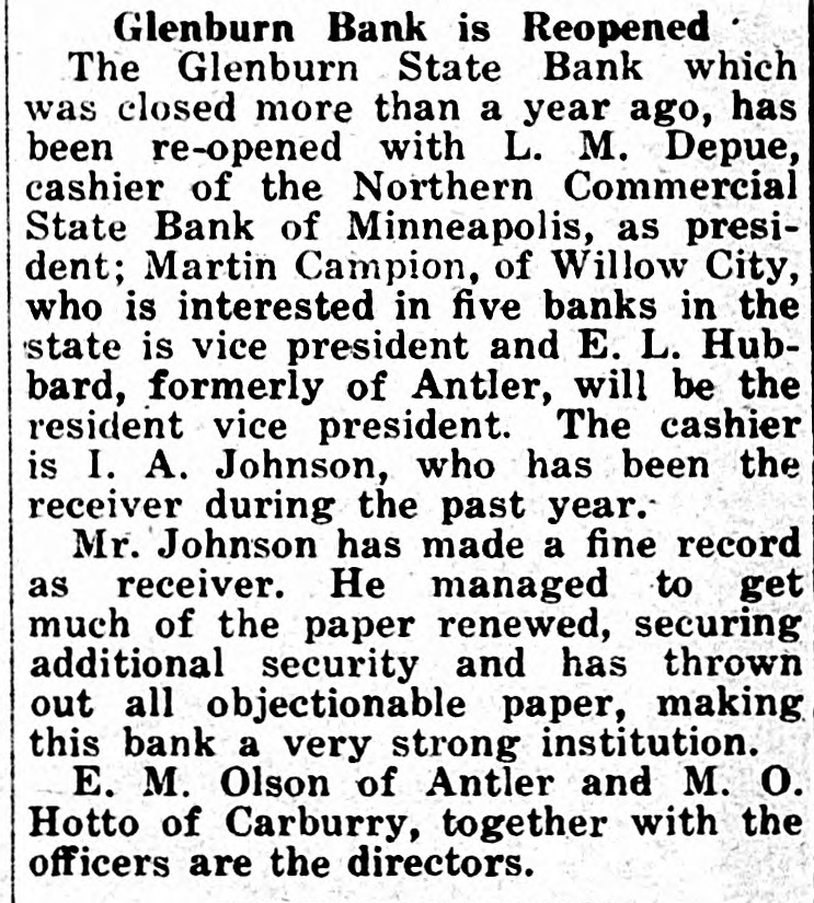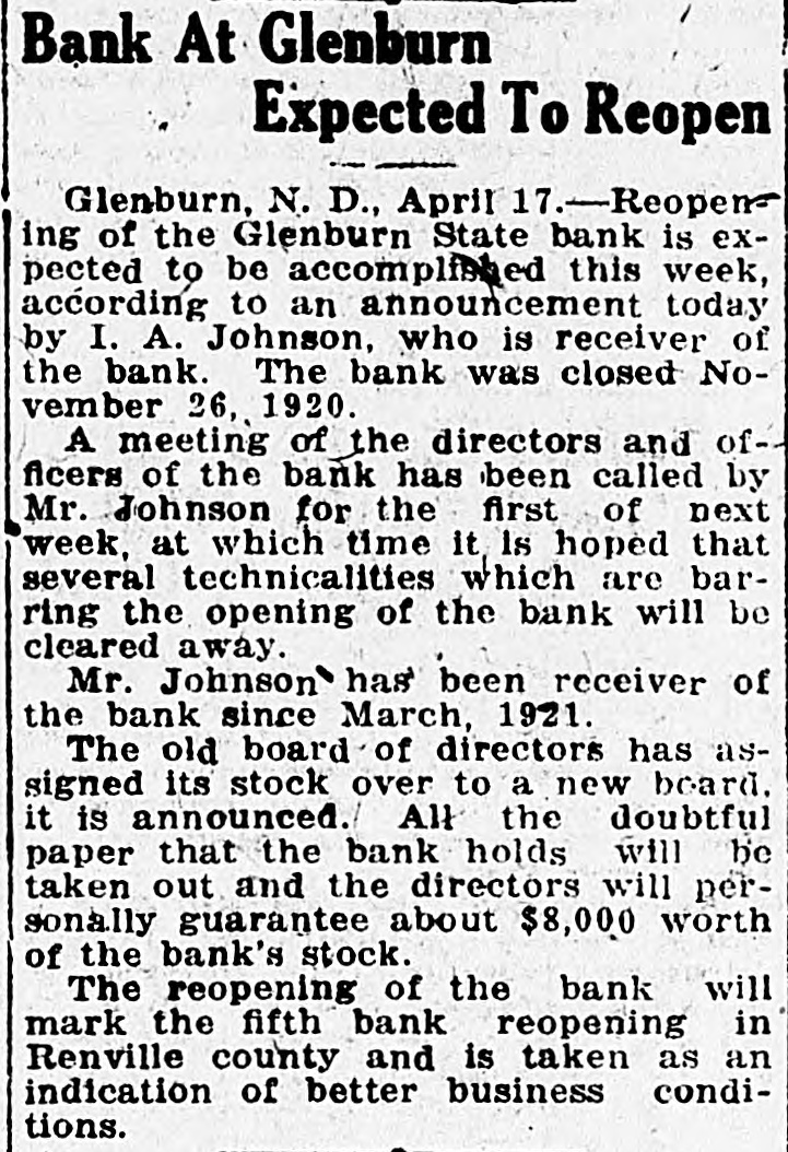Bank At Glenburn Expected To Reopen Glenburn, N. D., April 17.- - Reopening of the Glenburn State bank is expected to be accompl fished this week, according to an announcement today by I. A. Johnson, who is receiver of the bank. The bank was closed November 26, 1920. A meeting of the directors and officers of the bank has been called by Mr. Johnson for the first of next week, at which time it Is hoped that several technicalities which are barring the opening of the bank will be cleared away. Mr. Johnson has been receiver of the bank since March, 1921. The old board of directors has assigned its stock over to a new board. it is announced. All the doubtful paper that the bank holds will be taken out and the directors will personally guarantee about $8,000 worth of the bank's stock. The reopening of the bank will mark the fifth bank reopening in Renville county and is taken as an indication of better business conditions.