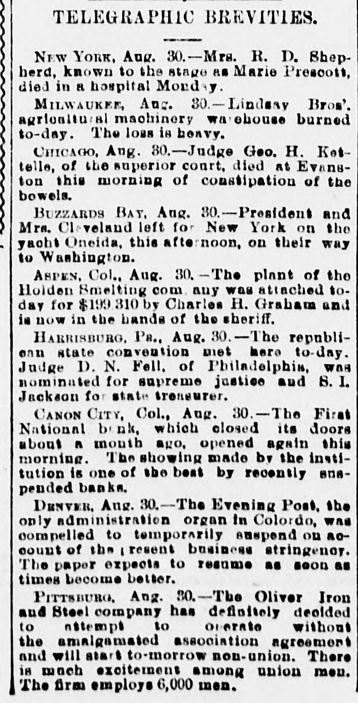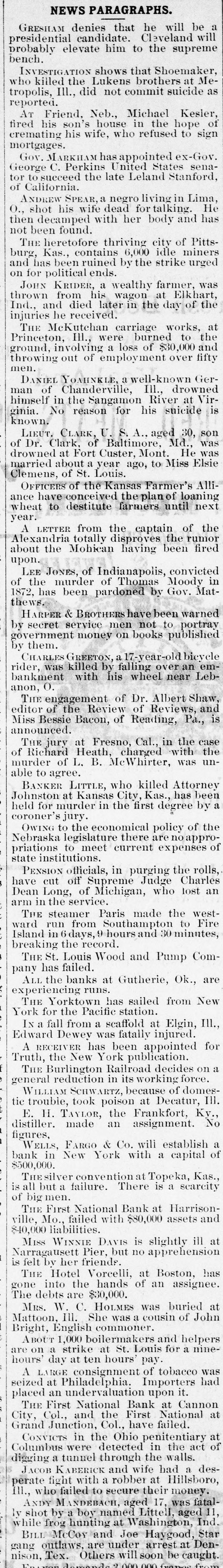 JOHN KRIDER, a wealthy farmer, was thrown from his wagon at Elkhart, Ind., and died later in the day of the injuries he received.