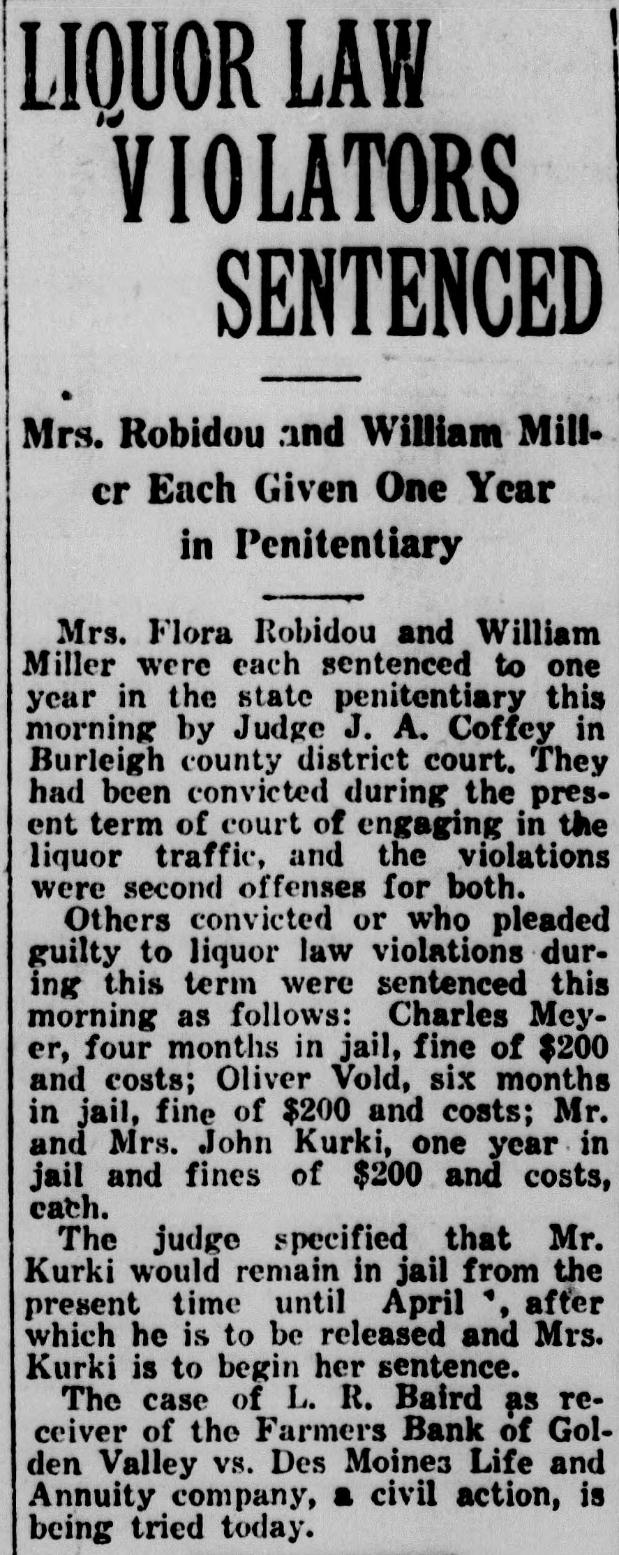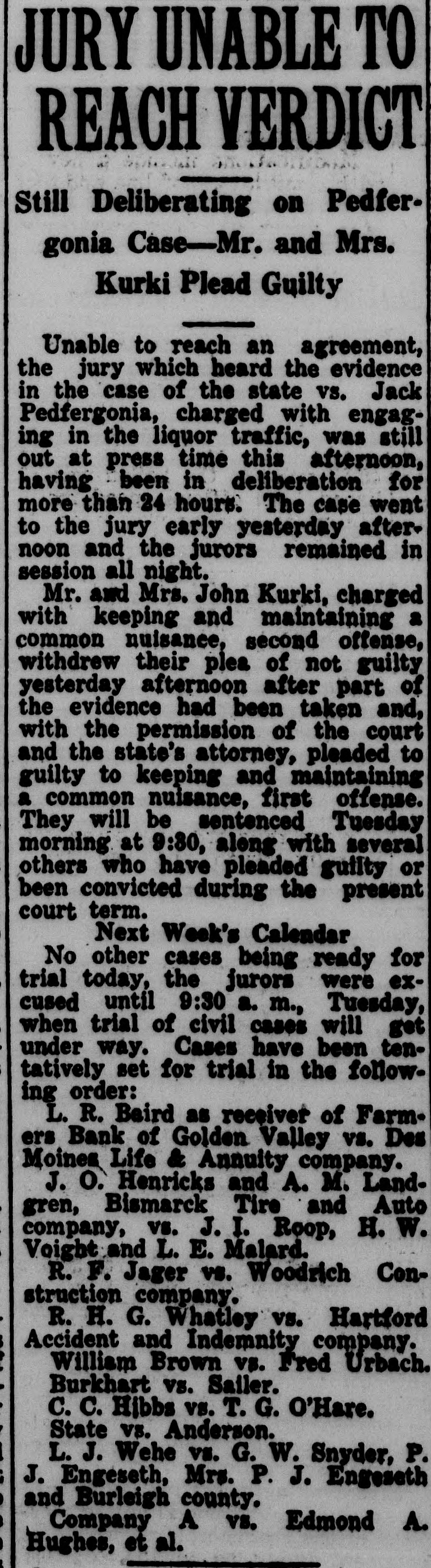 # JURY UNABLE TO # REACH VERDICT Still Deliberating on Pedfergonia Case-Mr. and Mrs. Kurki Plead Guilty Unable to reach an agreement, the jury which heard the evidence in the case of the state vs. Jack Pedfergonia, charged with engaging in the liquor traffic, was still out at press time this afternoon, having been in deliberation for more than 24 hours. The case went to the jury early yesterday afternoon and the jurors remained in session all night. Mr. and Mrs. John Kurki, charged with keeping and maintaining a common nuisance, second offense, withdrew their plea of not guilty yesterday afternoon after part of the evidence had been taken and, with the permission of the court and the state's attorney, pleaded to guilty to keeping and maintaining a common nuisance, first offense. They will be sentenced Tuesday morning at 9:30, along with several others who have pleaded guilty or been convicted during the present court term. # Next Week's Calendar No other cases being ready for trial today, the jurors were excused until 9:30 a. m., Tuesday, when trial of civil cases will get under way. Cases have been tentatively set for trial in the following order: L. R. Beird as receiver of Farmers Bank of Golden Valley vs. Des Moines Life & Annuity company. J. O. Henricks and A. M. Landgren, Bismarck Tire and Auto company, vs. J. I. Roop, H. W. Voight and L. E. Malard. R. F. Jager vs. Woodrich Construction company. R. H. G. Whatley vs. Hartford Accident and Indemnity company. William Brown vs. Fred Urbach. Burkhart vs. Sailer. C. C. Hibbs vs. T. G. O'Hare. State vs. Anderson. L. J. Wehe vs. G. W. Snyder, P. J. Engeseth, Mrs. P. J. Engeseth and Burleigh county. Company A vs. Edmond A. Hughes, et al.