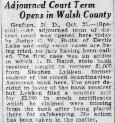 Grafton. N. D., Oct. 21.-(Speadjourned of district court was opened here today by Judge C. W. Buttz of Devils Lake and only court cases are being tried, no jury having been called. The first was an action in which L. R. Baird, state bank receiver, sought recover $1,000 from Stephen Lykken. former cashier of the closed ScandinavianAmerican bank here. The court decided in favor the bank receiver but Lykken filed counter suit for $2,000 in stock certificates which he claimed were missing from the bank after being placed there for safekeeping No action has been taken in the matter.