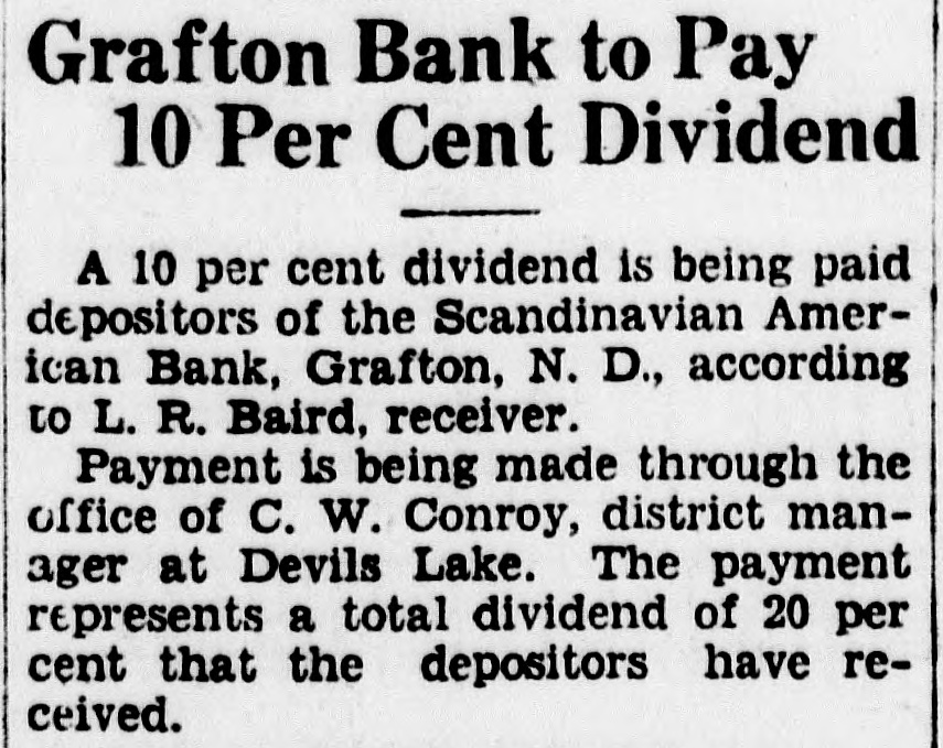 Grafton Bank to Pay 10 Per Cent Dividend A 10 per cent dividend is being paid depositors of the Scandinavian American Bank, Grafton, N. D., according to L. R. Baird, receiver. Payment is being made through the office of C. W. Conroy, district manager at Devils Lake. The payment represents a total dividend of 20 per cent that the depositors have received.