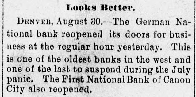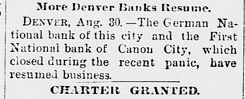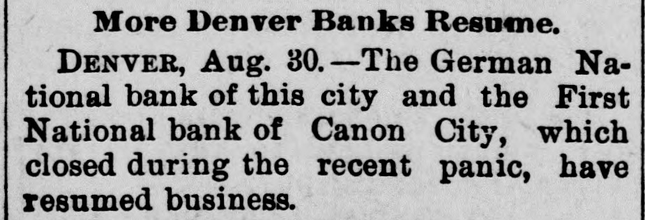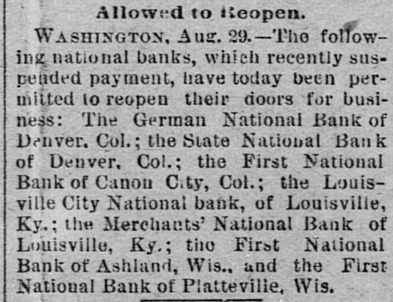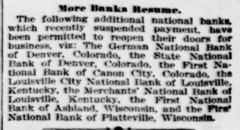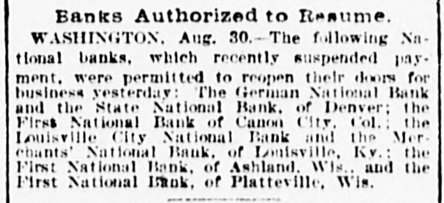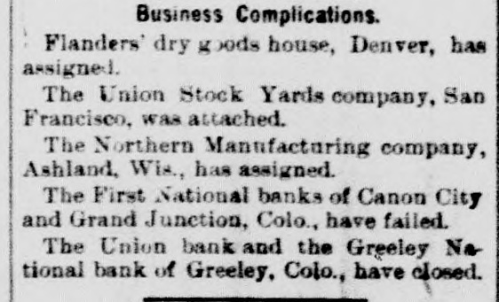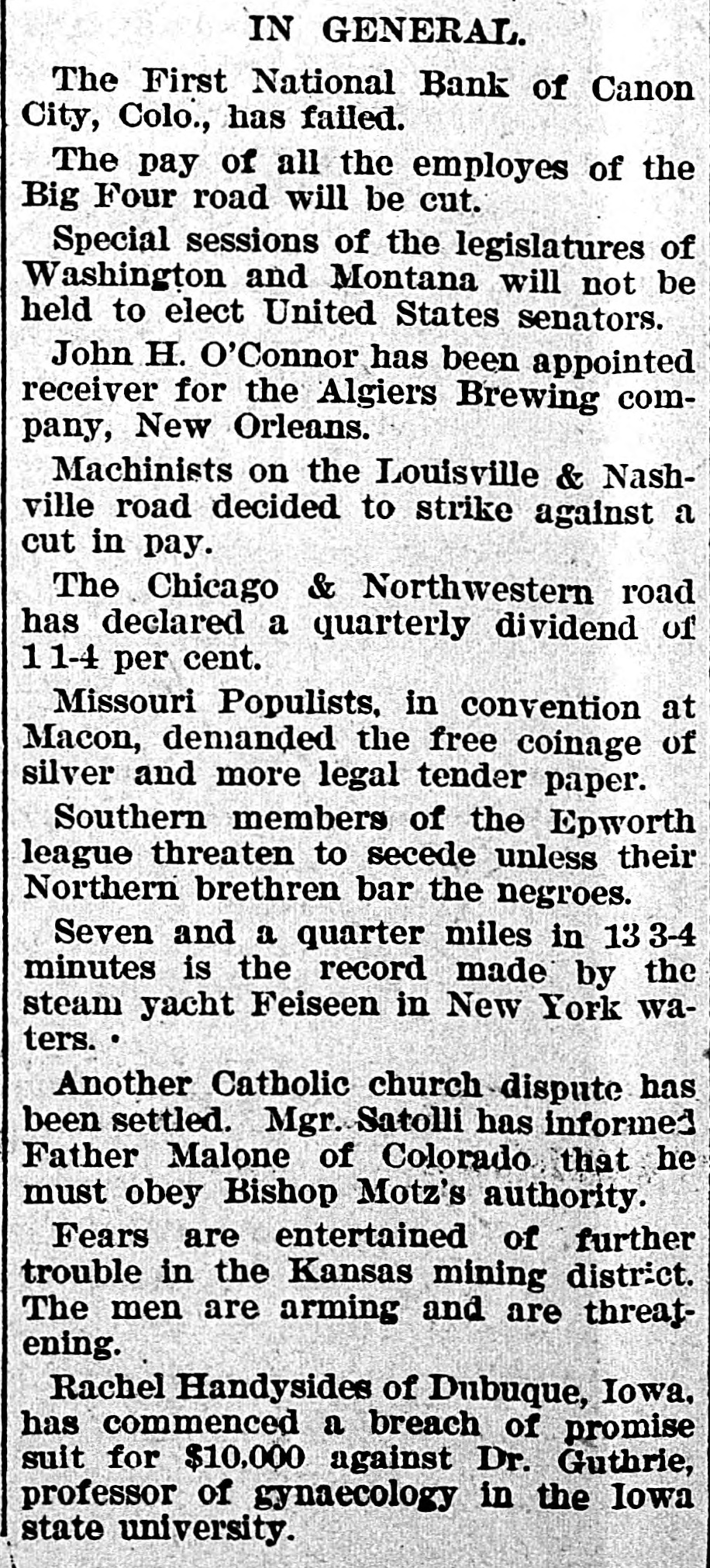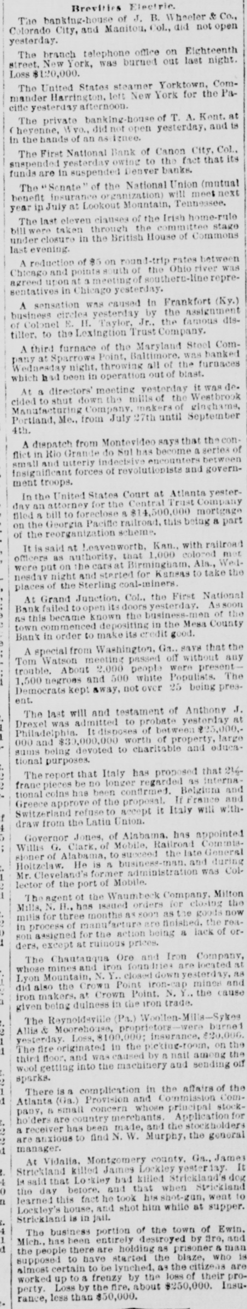 Brevities Electric The banking-house of J. B. Wheeler & Co., Colorado City, and Manitou, Col., did not open yesterday. The branch telephone office on Eighteenth street, New York, was burned out last night. $ $120,000. The United States steamer Yorktown, Commander Harrington, left New York for the Pacitic yesterday afternoon. The private banking-house of T. A. Kent. at ( heyenne, Wvo. did not open yesterday, and is in the hands of an asignee. The First National Bank of Canon City, Col. suspended yesterday owing to the fact that its funds are in suspended Denver banks. The "Senate' of the National Union (mutual benefit insurance organization) will meet next year in July at Lookout Mountain, Tennessee. The last eleven clauses of the Irish home-rule bill were taken through the committee stage under closure in the British House of Commons last evening. A reduction of 85 on round-trip rates between Chicago and points south of the Ohio river was agreed upon at meeting of southern-line representatives in Chicago yesterday. A sensation was caused in Frankfort (Ky.) business circlea yesterday by the assignment of Colonel E. 11. Taylor, Jr., the famous distilter, to the Lexingtion Trust Company. A third furnace of the Maryland Stool Company at Sparrows Point, Baltimore, was banked Wednesday night. throwing all of the furnaces which had been in operation out of blast. At a directors' meeting yesterday it was de. cided to shut down the mills of the Westbrook Manufacturing Company. makers of ginghame, Portland, Me., from July 27th until September 4th. A dispatch from Montevideo says that the confliet in Rio Grande do Sul has become a series of small and utterly indecisive encounters between insignificant forces of revolutionista and government troops. In the United States Court at Atlanta yesterday an attorney for the Central Trust Company filed a bill to foreclose a $14,500,000 mortgage on the Georgia Pacific railroad, this being a part of the reorganization scheme. It is said at Leavenworth, Kan., with railroad officers as authority, that 1.000 colored met were put on the cars at Birmingham, Ala., Wednesday night and started for Kaneas to take the places of the Sterling coal-miners. At Grand Junction, Col., the First National Bank failed to open its doors yesterday. Assoon this became known the business-men of the town commenced depositing in the Mesa County Bank in order to make its credit good. A special from Washington, Ga.. says that the Tom Watson meeting passed off without any trouble. About 2,000 people were present 1,500 negroes and 500 white Populists. The Democrats kept away, not over 25 being present. The last will and testament of Anthony J. Drexel was admitted to probate yesterday at Philadelphia. dtidposes of between $25,000.000 and $30,000,000 worth of property, large sums being devoted to charitable and educational purposes. The report that Italy has proposed that 21/6frane pieces be no longer regarded as international coins has been confirmed. Belgium and Greece approve of the proposal. If France and Switzerland refuse to accept it Italy will withf draw from the Latin Union. 4 Governor Jones, of Alabama. has appointed Willis G. Clark, of Mobile, Railrond Commiss sioner of Alabama, to succeed the late General Holtzclaw. He is a business-man. and during Mr. Cleveland's former administration was Collector of the port of Mobile The agent ot the Waumbeck Company. Milton Mills, N. H., has issued orders for closing the mills for three months 33 8007 as the goods now in process of manufacture are finished. the reason assigned for the action being a lack of or1 ders, except at ruinous prices. The Chautanqua Ore and Iron Company, whose mines and iron foundries are located Lyon Mountain, N.Y. closed yesterday. did also the Crown Point iron-cap mines and iron makers. at Crown Point. N.Y., the cause a given being dulness in the iron trade. The Reynoldsville (Pa.) Woolten-Milla-Sykes 2 Allis & Moorehouse, proprietors- burnet yesterday. Loss, 8100,000; insurance. $20,000. The fire originated in the picking-room, on the 1 third floor, and was caused by a nail among the wool getting into the machinery and sending off sparks. There is a complication in the affairs of the d Atlanta (Ga.) Provision and Commission Company, 8 small concern whose principal stockholders are country merchants. Application for a receiver has been made, and the stockholders are anxious to find N. W. Murphy, the general manager. ₫ At Vidalia. Montgomery county. Gs., James : Strickland killed James Lockley yesteria It 4 is said that Lockley had killed Strickland's dog 0 the day before. and that when Strickland n learned this fact he took his shot-gun, went to Lockley's house, and shot him while at supper. Strickland is in jail. 8. 4 The business portion of the town of Ewin, 1 Mich., has been entirely destroyed by fre, and d the people there are holding as prisoner & man supposed to have started the blaze, who is almost certain to be lynched, as the citizens are worked up to a frenzy by the loss of their property. Loss by the fire, about $250,000. Insurance, less than $50,000.