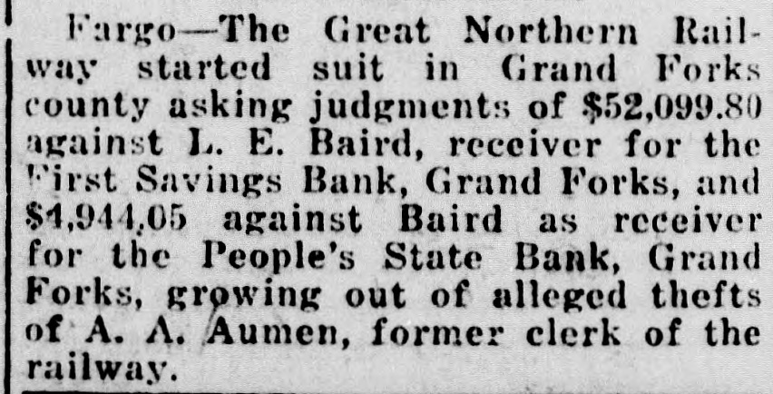 Fargo-The Great Northern Railway started suit in Grand Forks county asking judgments of $52,099.80 against L. E. Baird, receiver for the First Savings Bank, Grand Forks, and $4,944,05 against Baird as receiver for the People's State Bank, Grand Forks, growing out of alleged thefts of A. A. Aumen, former clerk of the railway.