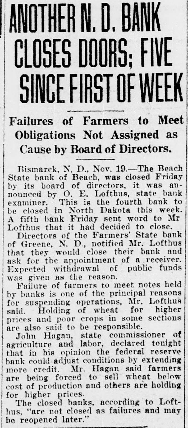 FOUR BANKS CLOSE IN NORTH DAKOTA "Not Shut as Failures," Says Bank Examiner, "May Be Reopened. BISMARCK, N. D., November 20.Directors of the Beach State Bank of Beach late yesterday informed O. E. Lofthus, state bank examiner, that they had closed the bank. This is the fourth bank to be closed in North Dakota this week. A fifth bank late yesterday sent word to Mr. Lofthus that it had decided to close. Directors of the Farmers' State Bank of Greene, N. D., notified Lofthus that they would close their institution and ask for the appointment of a receiver. Expected withdrawal of public funds deposited was given as the reason by the board of directors of the Farmers' State Bank. Greene is near Tolley, in Renville county, where a bank was closed several days ago. Failure of farmers to meet notes held by the banks is one of the principal reasons for suspending operations, Mr. Lofthus said. Holding of wheat for higher prices and poor crops "in some sections also are responsible, it is said. John Hagan, state commissioner of agriculture and labor, declared that in his opinion the federal reserve bank could adjust conditions by extending more credit. Mr. Hagan said farmers are holding for higher prices. The closed banks, according to Mr. Lofthus, "are not closed as failures, and may be reopened later."