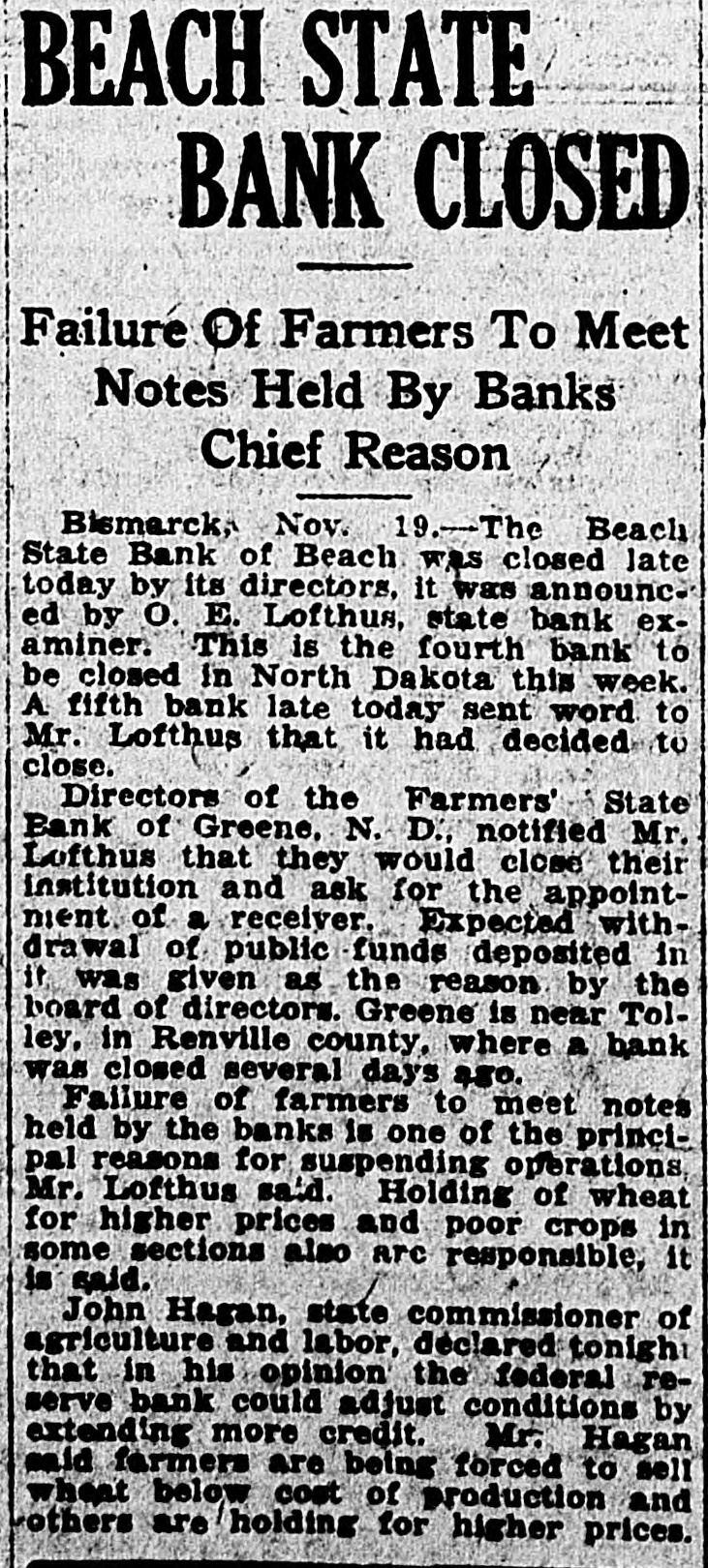 BEACH STATE BANK CLOSED Failure Of Farmers To Meet Notes Held By Banks Chief Reason Bismarck, Nov. 19.-The Beach State Bank of Beach was closed late today by its directors, it was announced by O. E. Lofthus, state bank examiner. This is the fourth bank to be closed in North Dakota this week. A fifth bank late today sent word to Mr. Lofthus that it had decided to close. Directors of the Farmers' State Bank of Greene, N. D., notified Mr. Lofthus that they would close their institution and ask for the appointment of a receiver. Expected withdrawal of public funds deposited in it was given as the reason by the board of directors. Greene is near Tolley, in Renville county, where a bank was closed several days 480. Failure of farmers to meet notes held by the banks is one of the principal reasons for suspending operations Mr. Lofthus said. Holding of wheat for higher prices and poor crops in some sections also are responsible, it is said. John Hagan, state commissioner of agriculture and labor, declared tonight that in his opinion the federal reserve bank could adjust conditions by extending more credit. Mr. Hagan said farmers are being forced to sell wheat below cost of production and others are holding for higher prices.