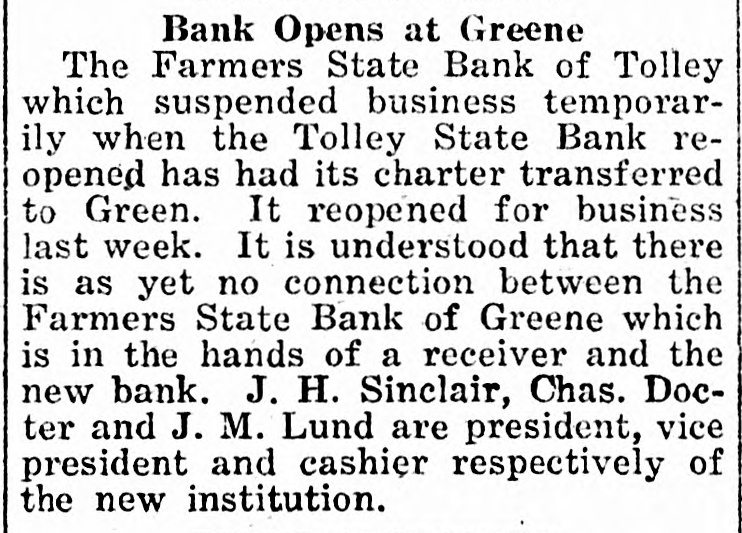 Bank Opens at Greene The Farmers State Bank of Tolley which suspended business temporarily when the Tolley State Bank reopened has had its charter transferred to Green. It reopened for business last week. It is understood that there is as yet no connection between the Farmers State Bank of Greene which is in the hands of a receiver and the new bank. J. H. Sinclair, Chas. Docter and J. M. Lund are president, vice president and cashier respectively of the new institution.