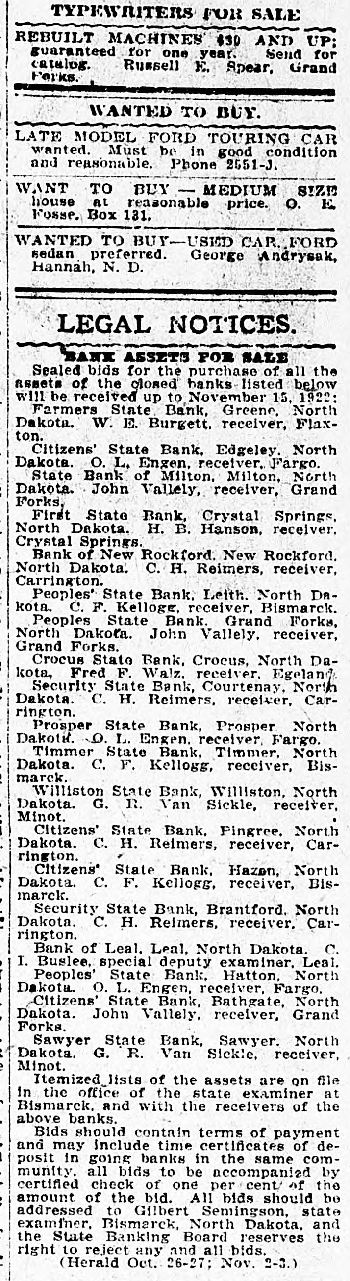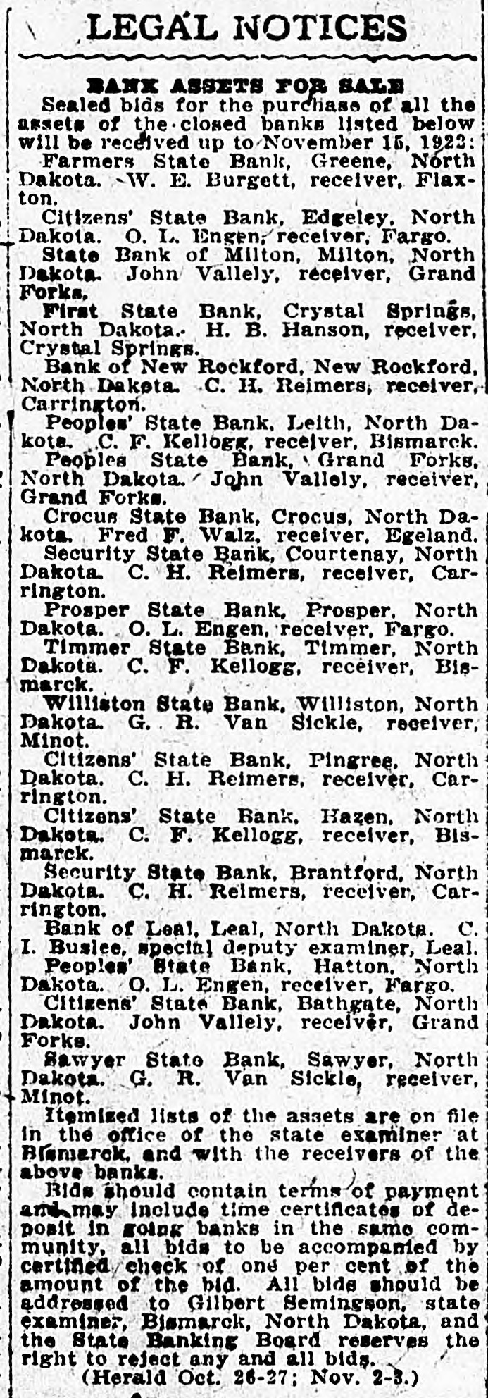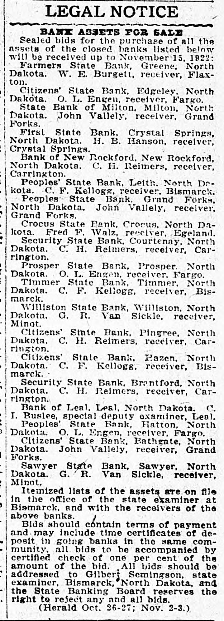 LEGAL NOTICE BANK ASSETS FOR SALE Sealed bids for the purchase of all the assets of the closed banks listed below will be received up to November 15, 1922: Farmers State Bank, Greene, North Dakota. W. E. Burgett, receiver, Flaxton. Citizens' State Bank, Edgeley. North Dakota. O. L. Engen, receiver, Fargo. State Bank of Milton. Milton, North Dakota. John Vallely, receiver, Grand Forks. First State Bank, Crystal Springs, North Dakota. H. B. Hanson, receiver, Crystal Springs. Bank of New Rockford. New Rockford, North Dakota. C. H. Reimers, receiver, Carrington. Peoples' State Bank, Leith. North Dakota. C. F. Kellogg. receiver. Bismarck. Peoples State Bank, Grand Forks, North Dakota. John Vallely, receiver, Grand Forks. Crocus State Bank, Crocus, North Dakota. Fred F. Walz, receiver. Egeland. Security State Bank, Courtenay, North Dakota. C. H. Reimers, receiver, Carrington. Prosper State Bank, Prosper. North Dakota. O. L. Engen. receiver, Fargo. Timmer State Bank, Timmer. North Dakota. C. F. Kellogg. receiver, Bismarck. Williston State Bank, Williston. North Dakota. G. R. Van Sickle, receiver, Minot. Citizens' State Bank, Pingree, North Dakota. C. H. Reimers, receiver, Carrington. Citizens' State Bank, Hazen. North Dakota. C. F. Kellogg, receiver, Bismarck. Security State Bank, Brantford, North Dakota. C. H. Reimers, receiver, Carrington. Bank of Leal. Leal, North Dakota. C. I. Buslee, special deputy examiner, Leal. Peoples' State Bank, Hatton, North Dakota. O. L. Engen, receiver, Fargo. Citizens' State Bank, Bathgate, North Dakota. John Vallely, receiver, Grand Forks. Sawyer State Bank, Sawyer, North Dakota. G. R. Van Sickle, receiver, Minot. Itemized lists of the assets are on file in the office of the state examiner at Bismarck, and with the receivers of the above banks. Bids should contain terms of payment and may include time certificates of deposit in going banks in the same community, all bids to be accompanied by certified check of one per cent of the amount of the bid. All bids should be addressed to Gilbert Semingson, state examiner, Bismarck, North Dakota, and the State Banking Board reserves the right to reject any and all bids. (Herald Oct. 26-27; Nov. 2-3.)