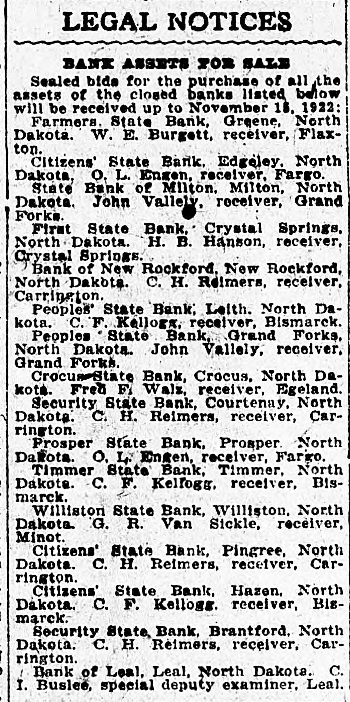 LEGAL NOTICES BANK ASSETS FOR SALE Sealed bids for the purchase of all the assets of the closed banks listed below will be received up to November 15, 1922: Farmers. State Bank, Greene, North Dakota. W. E. Burgett, receiver, Flaxton. Citizens' State Bank, Edgeley. North Dakota, O. L. Engen, receiver, Fargo. State Bank of Milton. Milton, North Dakota. John Vallely, receiver, Grand Forks. First State Bank, Crystal Springs, North Dakota. H. B. Hanson, receiver, Crystal Springs. Bank of New Rockford. New Rockford, North Dakota. C. H. Reimers, receiver, Carrington. Peoples' State Bank; Leith. North Dakota. C.F. Kellogs, receiver, Bismarck. Peoples State Bank, Grand Forks, North Dakota. John Vallely, receiver, Grand Forks. CrocumState Bank, Crocus, North Dakota. Fred F Walz, receiver, Egeland. Security State Bank, Courtenay, North Dakota. C. H. Reimers, receiver, Carrington. Prosper State Bank, Prosper. North Dakota. O. L. Engen, receiver, Fargo. Timmer State Bank, Timmer, North Dakota. C. F. Kelfogg, receiver, Bismarck. Williston State Bank, Williston, North Dakota. G. R. Van Sickle, receiver, Minot. Citizens' State Bank, Pingree, North Dakota. C. H. Reimers, receiver, Carrington. Citizens' State Bank, Hazen. North Dakota. C. F. Kellogs. receiver, Bismarck. Security State, Bank, Brantford, North Dakota. C. H. Reimers, receiver, Carrington. / Bank of Leal, Leal, North Dakota. C. I. Buslee, special deputy examiner, Leal.