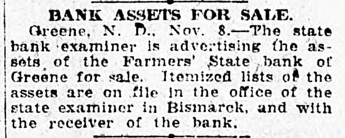 BANK ASSETS FOR SALE. Greene, N. D., Nov. 8.-The state bank examiner is advertising the assets, of the Farmers' State bank of Greene for sale. Itemized lists of the assets are on file in the office of the state examiner in Bismarck, and with the receiver of the bank.