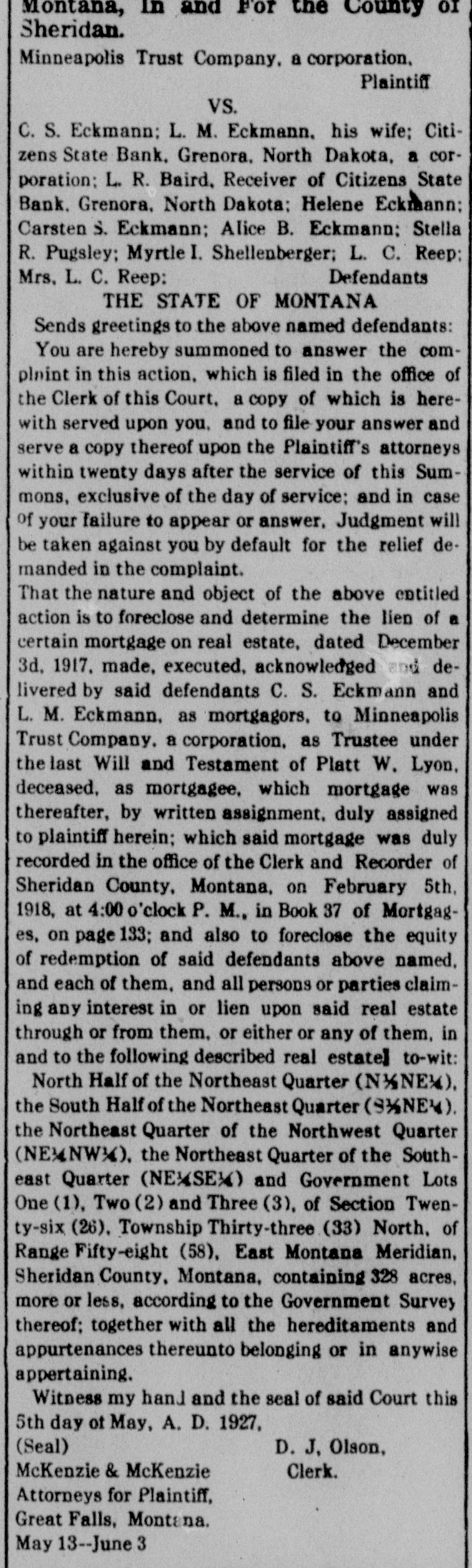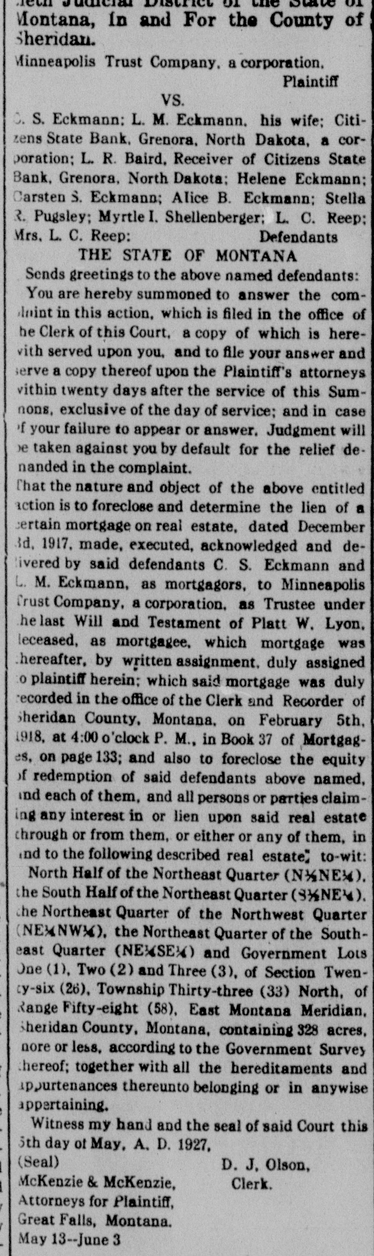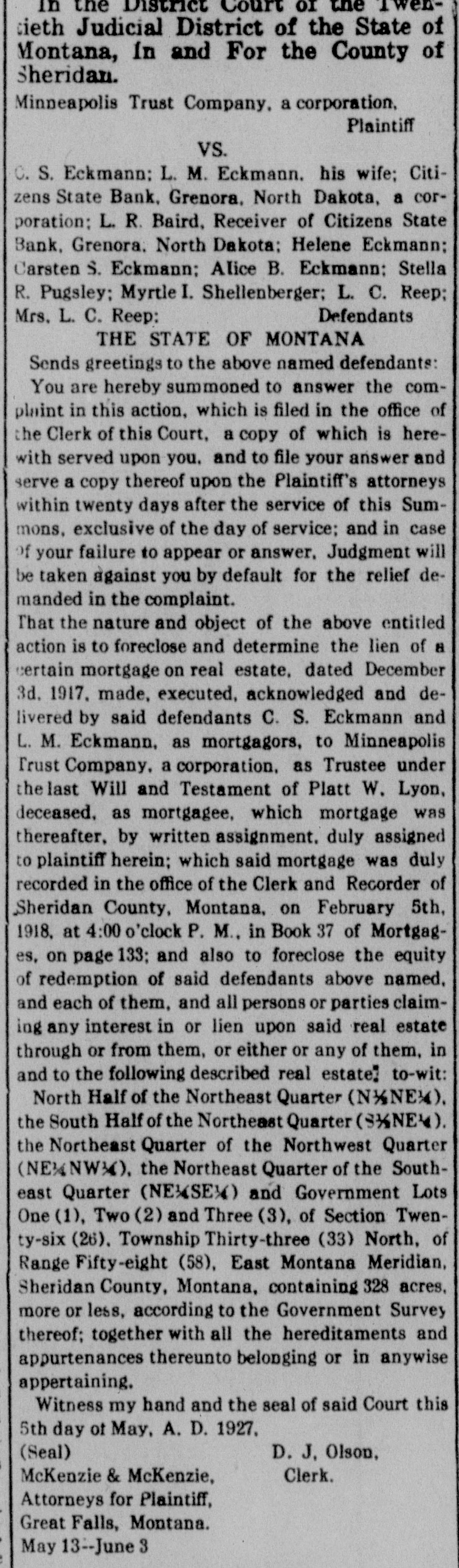 That the nature and object of the above entitled action is to foreclose and determine the lien of a certain mortgage on real estate, dated December 3d, 1917, made, executed, acknowledged and delivered by said defendants C. S. Eckmann and L. M. Eckmann, as mortgagors, to Minneapolis Trust Company, a corporation, as Trustee under the last Will and Testament of Platt W. Lyon, deceased, as mortgagee, which mortgage was thereafter, by written assignment, duly assigned to plaintiff herein; which said mortgage was duly recorded in the office of the Clerk and Recorder of Sheridan County, Montana, on February 5th, 1918, at 4:00 o'clock P. M., in Book 37 of Mortgages, on page 133; and also to foreclose the equity of redemption of said defendants above named, and each of them, and all persons or parties claiming any interest in or lien upon said real estate through or from them, or either or any of them, in and to the following described real estate] to-wit: North Half of the Northeast Quarter (N½NE¼), the South Half of the Northeast Quarter (S½NE¼), the Northeast Quarter of the Northwest Quarter (NE¼NW¼), the Northeast Quarter of the Southeast Quarter (NE¼SE¼) and Government Lots One (1), Two (2) and Three (3), of Section Twenty-six (26), Township Thirty-three (33) North, of Range Fifty-eight (58), East Montana Meridian, Sheridan County, Montana, containing 328 acres, more or less, according to the Government Survey thereof; together with all the hereditaments and appurtenances thereunto belonging or in anywise appertaining.