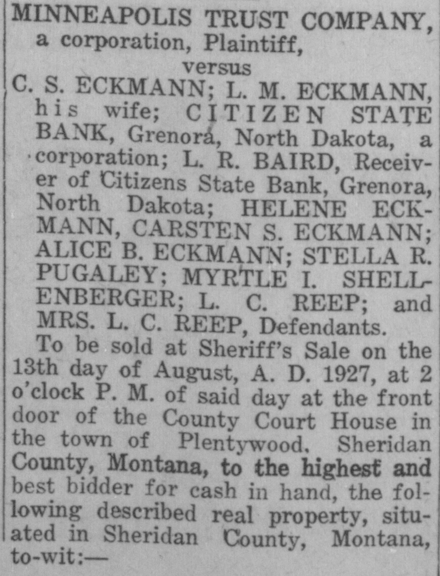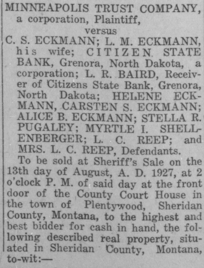 C. S. Eckmann; L. M. Eckmann, his wife; Citizens State Bank, Grenora, North Dakota, a corporation; L. R. Baird, Receiver of Citizens State Bank, Grenora, North Dakota; Helene Eckmann; Carsten S. Eckmann; Alice B. Eckmann; Stella R. Pugsley; Myrtle I. Shellenberger; L. C. Reep; Mrs, L. C. Reep: Defendants