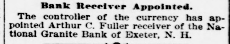 Bank Receiver Appointed. The controller of the currency has appointed Arthur C. Fuller receiver of the National Granite Bank of Exeter, N. H.