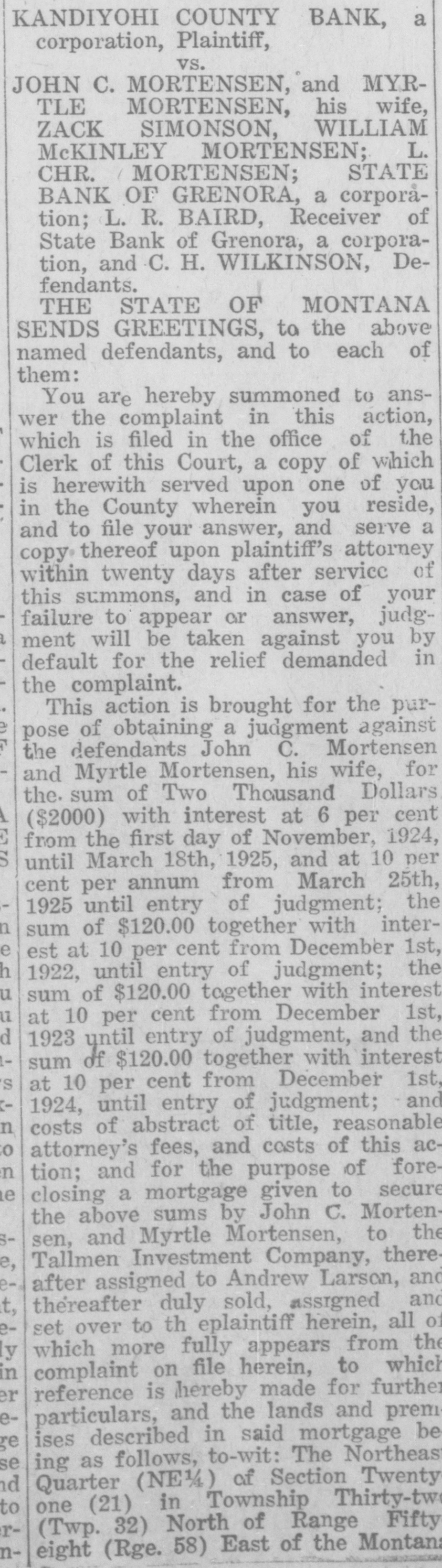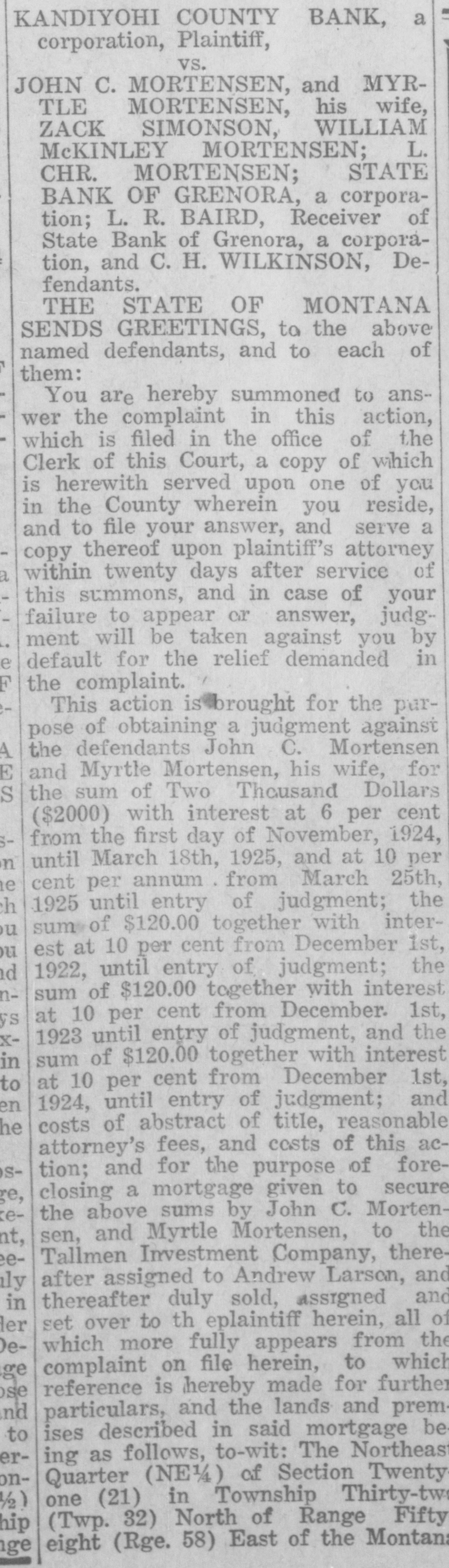KANDIYOHI COUNTY BANK, a corporation, Plaintiff, VS. JOHN C. MORTENSEN, and MYR- TLE MORTENSEN, his wife, ZACK SIMONSON, WILLIAM McKINLEY MORTENSEN; L. CHR. MORTENSEN; STATE BANK OF GRENORA, a corpora- tion; L. R. BAIRD, Receiver of State Bank of Grenora, a corpora- tion, and C. H. WILKINSON, De- fendants. THE STATE OF MONTANA SENDS GREETINGS, to the above named defendants, and to each of them: You are hereby summoned to answer the complaint in this action, which is filed in the office of the Clerk of this Court, a copy of which is herewith served upon one of you in the County wherein you reside, and to file your answer, and serve a copy thereof upon plaintiff's attorney within twenty days after service of this summons, and in case of your failure to appear or answer, judgment will be taken against you by default for the relief demanded in the complaint. This action is brought for the purpose of obtaining a judgment against the defendants John C. Mortensen and Myrtle Mortensen, his wife, for the sum of Two Thousand Dollars ($2000) with interest at 6 per cent from the first day of November, 1924, until March 18th, 1925, and at 10 per cent per annum from March 25th, 1925 until entry of judgment; the sum of $120.00 together with interest at 10 per cent from December 1st, 1922, until entry of judgment; the sum of $120.00 together with interest at 10 per cent from December 1st, 1923 until entry of judgment, and the sum of $120.00 together with interest at 10 per cent from December 1st, 1924, until entry of judgment; and the costs of abstract of title, reasonable attorney's fees, and costs of this action; and for the purpose of foreclosing a mortgage given to secure the above sums by John C. Mortensen, and Myrtle Mortensen, to the Tallmen Investment Company, thereafter assigned to Andrew Larson, and in thereafter duly sold, assigned and set over to th eplaintiff herein, all of which more fully appears from the complaint on file herein, to which reference is hereby made for further and particulars, and the lands and premises described in said mortgage being as follows, to-wit: The Northeast Quarter (NE¼) of Section Twenty-one (21) in Township Thirty-two (Twp. 32) North of Range Fifty eight (Rge. 58) East of the Montana