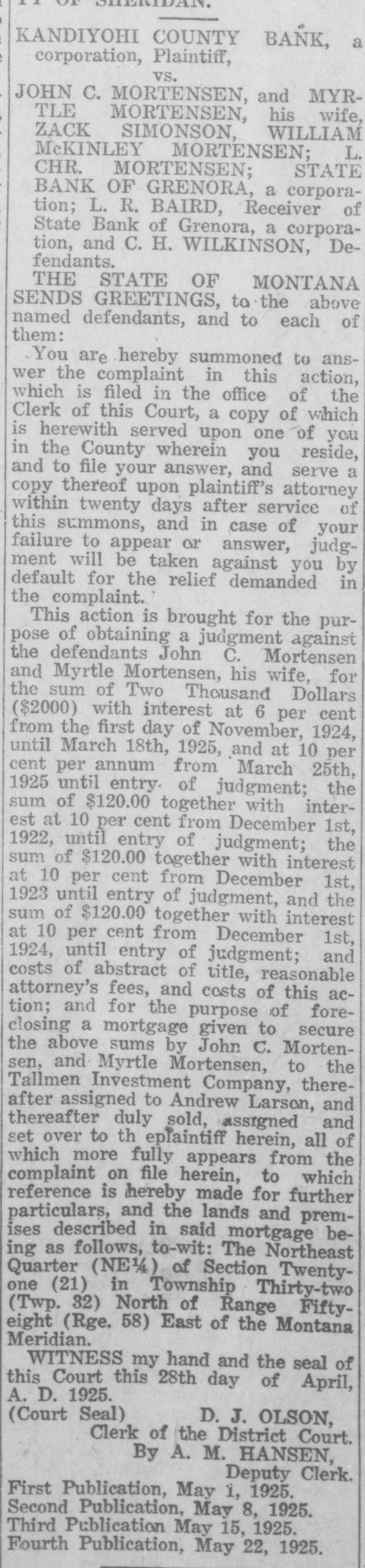 KANDIYOHI COUNTY BANK, a corporation, Plaintiff, vs. JOHN C. MORTENSEN, and MYRTLE MORTENSEN, his wife, ZACK SIMONSON, WILLIAM McKINLEY MORTENSEN; L. CHR. MORTENSEN; STATE BANK OF GRENORA, a corporation; L. R. BAIRD, Receiver of State Bank of Grenora, a corporation, and C. H. WILKINSON, Defendants. THE STATE OF MONTANA SENDS GREETINGS, to the above named defendants, and to each of them: You are hereby summoned to answer the complaint in this action, which is filed in the office of the Clerk of this Court, a copy of which is herewith served upon one of you in the County wherein you reside, and to file your answer, and serve a copy thereof upon plaintiff's attorney within twenty days after service of this summons, and in case of your failure to appear ar answer, judgment will be taken against you by default for the relief demanded in the complaint. This action is brought for the purpose of obtaining a judgment against the defendants John C. Mortensen and Myrtle Mortensen, his wife, for the sum of Two Thousand Dollars ($2000) with interest at 6 per cent from the first day of November, 1924, until March 18th, 1925, and at 10 per cent per annum from March 25th, 1925 until entry. of judgment; the sum of $120.00 together with interest at 10 per cent from December 1st, 1922, until entry of judgment; the sum of $120.00 together with interest at 10 per cent from December 1st, 1923 until entry of judgment, and the sum of $120.00 together with interest at 10 per cent from December 1st, 1924, until entry of judgment; and costs of abstract of title, reasonable attorney's fees, and costs of this action; and for the purpose of foreclosing a mortgage given to secure the above sums by John C. Mortensen, and Myrtle Mortensen, to the Tallmen Investment Company, thereafter assigned to Andrew Larson, and thereafter duly sold, assigned and set over to th eplaintiff herein, all of which more fully appears from the complaint on file herein, to which reference is hereby made for further particulars, and the lands and premises described in said mortgage being as follows, to-wit: The Northeast Quarter (NE½) of Section Twentyone (21) in Township Thirty-two (Twp. 32) North of Range Fiftyeight (Rge. 58) East of the Montana Meridian. WITNESS my hand and the seal of this Court this 28th day of April, A. D. 1925. (Court Seal) D. J. OLSON, Clerk of the District Court. By A. M. HANSEN, Deputy Clerk. First Publication, May 1, 1925. Second Publication, May 8, 1925. Third Publication May 15, 1925. Fourth Publication, May 22, 1925.