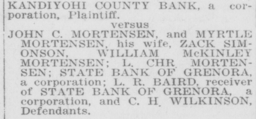 KANDIYOHI COUNTY BANK, a corporation, Plaintiff. versus JOHN C. MORTENSEN, and MYRTLE MORTENSEN, his wife, ZACK SIMONSON, WILLIAM MCKINLEY MORTENSEN; L. CHR MORTENSEN; STATE BANK OF GRENORA, a corporation; L. R. BAIRD, receiver of STATE BANK OF GRENORA, a corporation, and C. H. WILKINSON, Defendants.