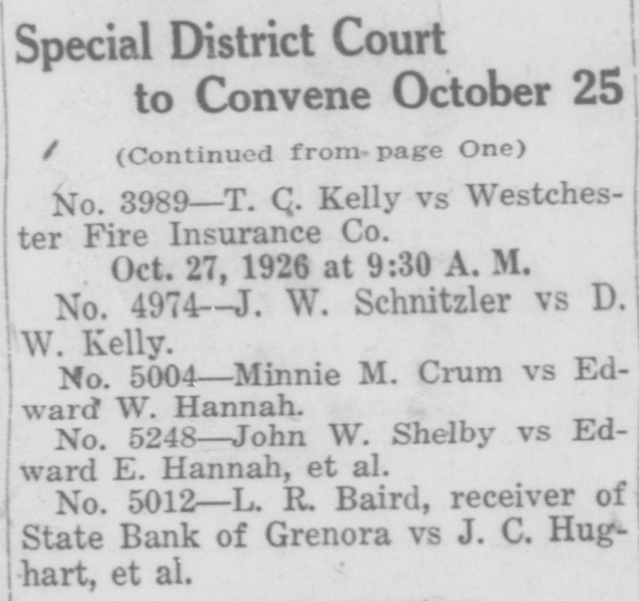 # Special District Court to Convene October 25 (Continued from page One) No. 3989—T. C. Kelly vs Westchester Fire Insurance Co. Oct. 27, 1926 at 9:30 A. M. No. 4974—J. W. Schnitzler vs D. W. Kelly. No. 5004—Minnie M. Crum vs Edward W. Hannah. No. 5248—John W. Shelby vs Edward E. Hannah, et al. No. 5012—L. R. Baird, receiver of State Bank of Grenora vs J. C. Hughart, et al.