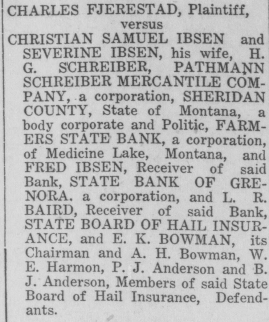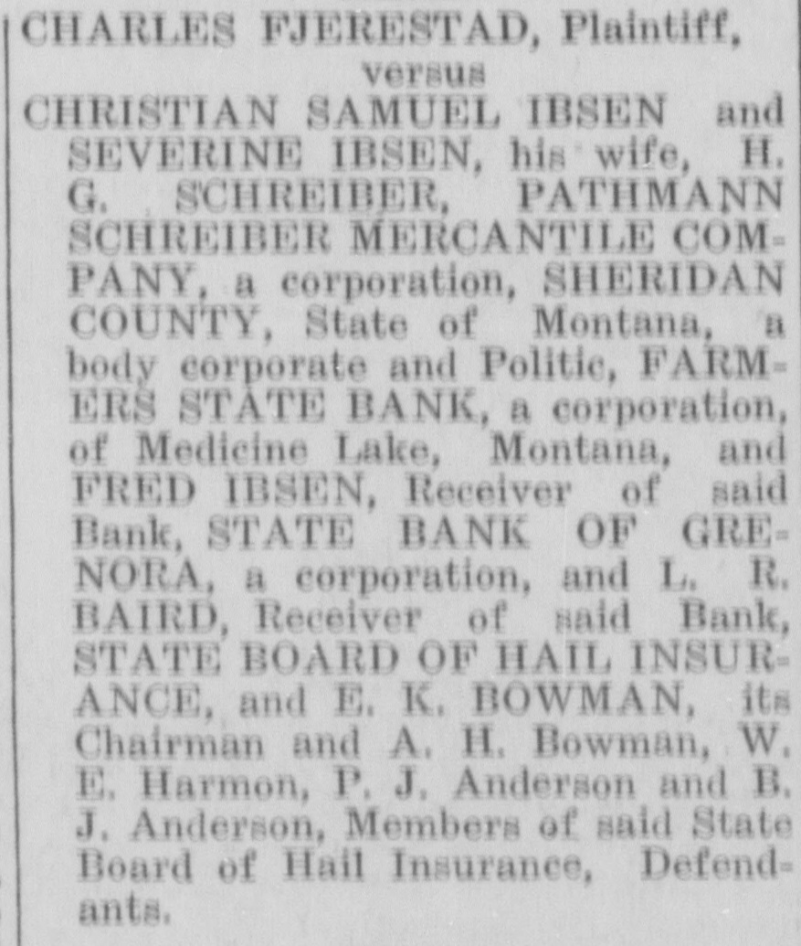 CHARLES FJERESTAD, Plaintiff, versus CHRISTIAN SAMUEL IBSEN and SEVERINE IBSEN, his wife, H. PATHMANN G. SCHREIBER, SCHREIBER MERCANTILE COMPANY, a corporation, SHERIDAN COUNTY, State of Montana, a body corporate and Politic, FARMERS STATE BANK, a corporation, of Medicine Lake, Montana, and FRED IBSEN, Receiver of said Bank, STATE BANK OF GRE= NORA, a corporation, and L. R. BAIRD, Receiver of said Bank, STATE BOARD OF HAIL INSURANCE, and E. K. BOWMAN, its Chairman and A. H. Bowman, W. E. Harmon, P. J. Anderson and B. J. Anderson, Members of said State Board of Hail Insurance, Defendants.